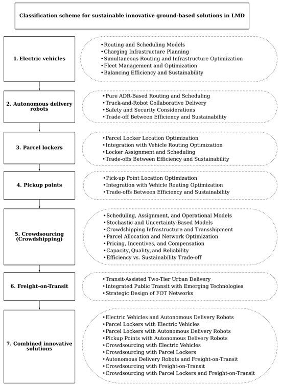In this systematic review, we focus on sustainable, innovative ground-based solutions in LMD from an OR perspective, which, to the best of our knowledge, has not been studied in the literature. Additionally, to the best of the authors’ knowledge, this literature review is a first attempt to investigate combined (hybrid) innovative solutions. Conducting a review from an OR perspective not only highlights existing shortcomings but also provides a structured framework for identifying, analyzing, and recommending strategies that bridge gaps in the literature. Previous reviews of ground-based LMDs exist in the literature, but our work differs from them in both focus and approach. For example, the works of [27,28,32,33,34] reviewed innovative solutions in LMD, but their perspectives were not from an OR perspective. In addition, ref. [35] reviewed the LMD and transportation logistics from a non-OR (i.e., stakeholder) perspective, which differs from our focus in the present work. Moreover, ref. [1] studied innovative solutions in LMD, but they investigated LMD in terms of efficiency, rather than sustainability. Two review works of [12,17] are the most similar works to this present paper in terms of studying the innovative solution in ground-based LMD from an OR perspective; however, the former work has not focused on sustainability, and also our work is more complete and detailed than the later work by investigating more problems and sub-problems in terms of OR. Additionally, the work of [12] did not review the CS, unlike our current review. To organize the review conceptually rather than descriptively, we introduce a conceptual framework that maps OR technique classes to sustainability goals and metrics; this framework precedes the per-innovation sections and anchors the comparative analysis presented later.