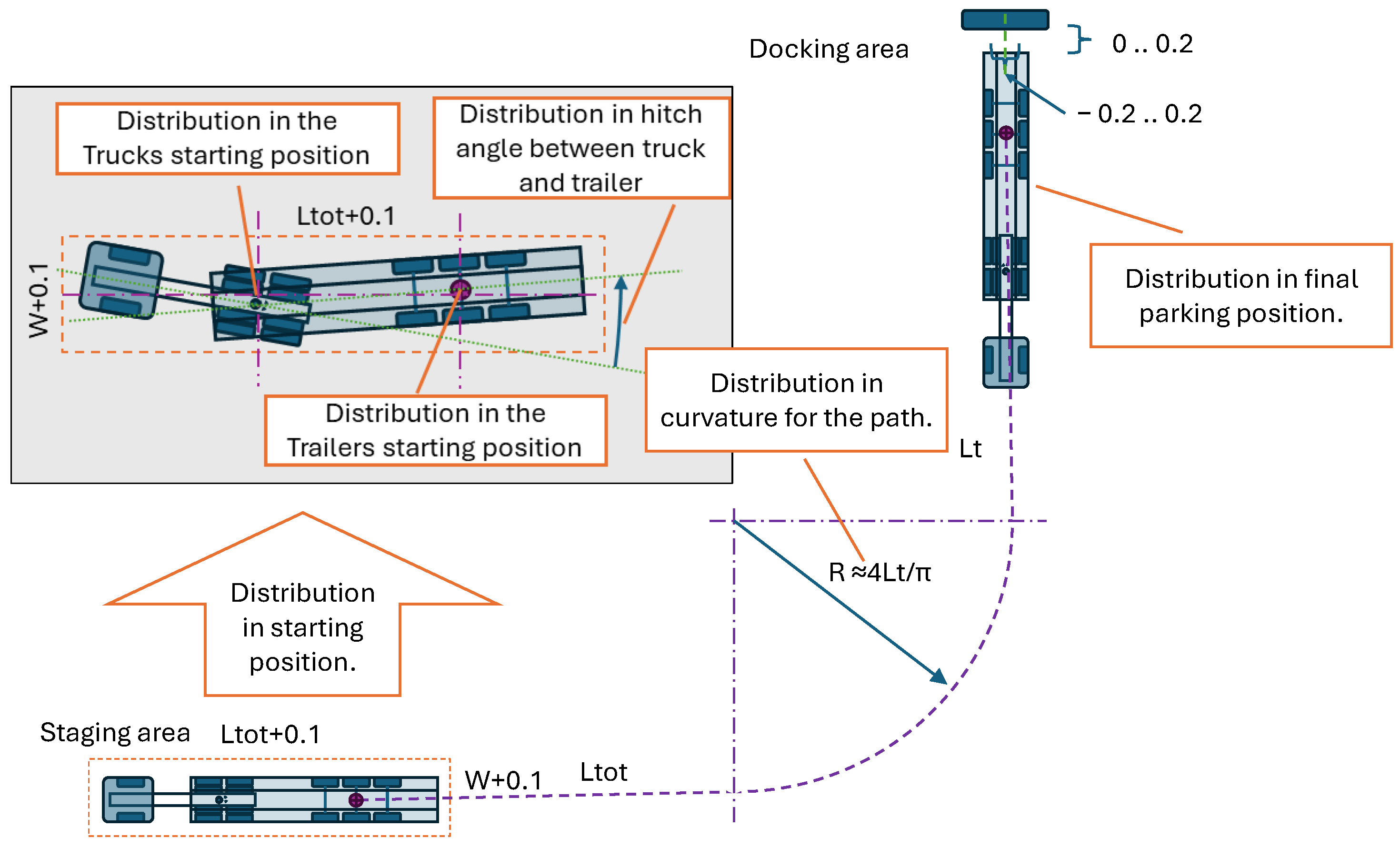 Common for all performed tests is that the trucks start from the staging area. For the physical tests with the scaled model truck, the starting positions are limited to the positions shown in