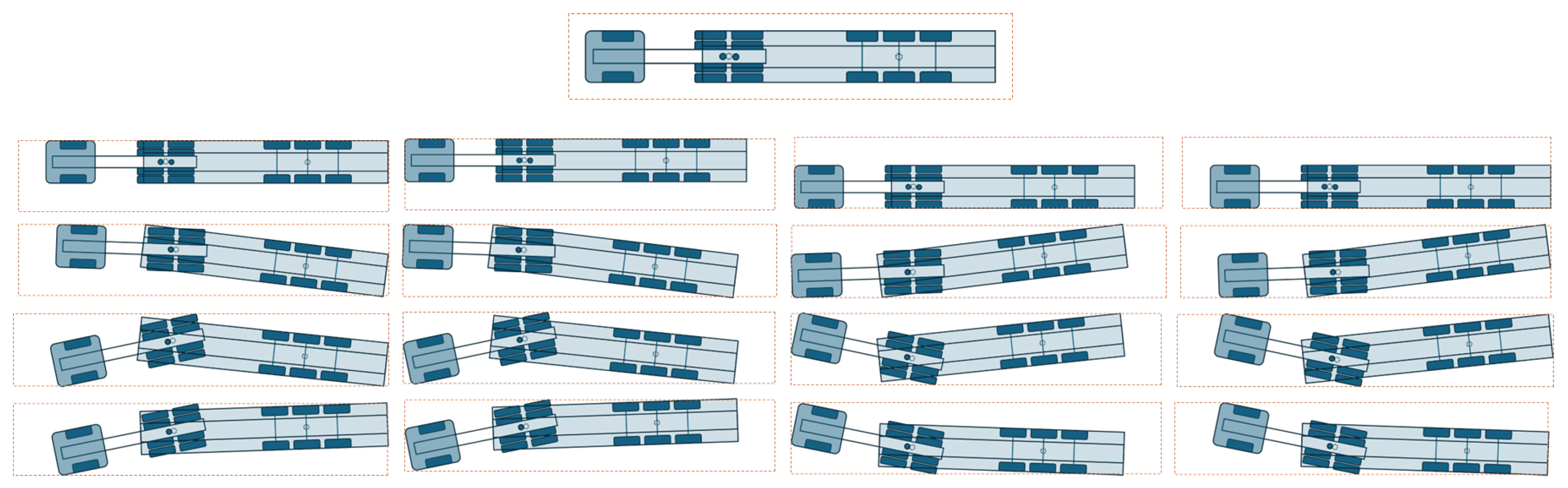 Figure 9, ensuring both typical and extreme conditions are represented in the analysis. For the physical tests using the scaled truck, 17 scenarios were selected, which include the nominal start position and the 16 edge-case starting positions from