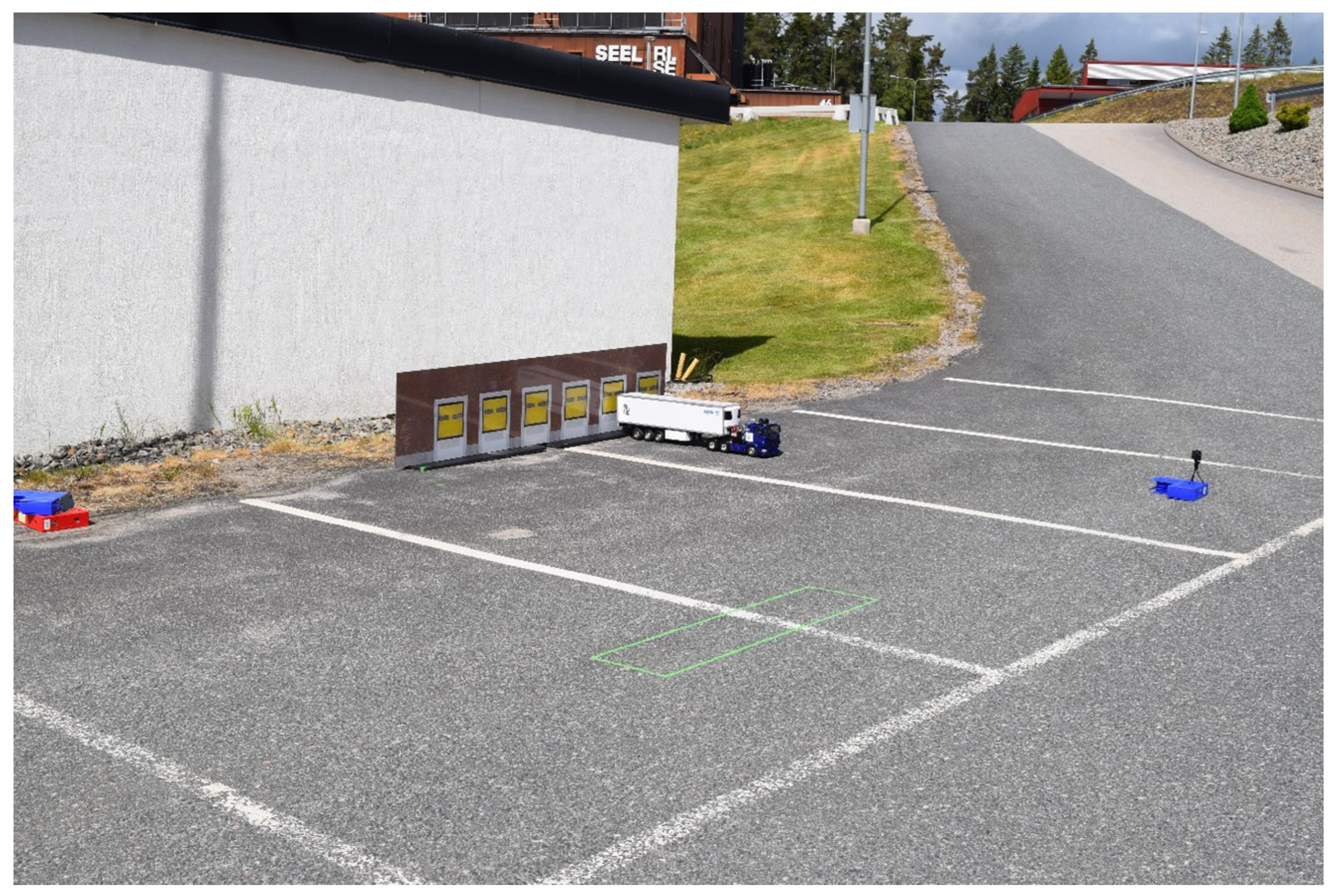 The scaled testing environment uses a 1:14-scale Tamiya Scania R620 model truck coupled with a matching Tamiya semi-trailer of the same scale. To closely mirror the simulated logistics hub, its 3D CAD model from CARLA was used to generate a 1:14-scale printout of the hub’s front facade, representing the docking environment in the scaled setup. A flat parking lot was used to recreate the hub area, with the staging area marked on the ground and the docking hub positioned according to the 1:14 scale and following scenario specifications. This setup, shown in