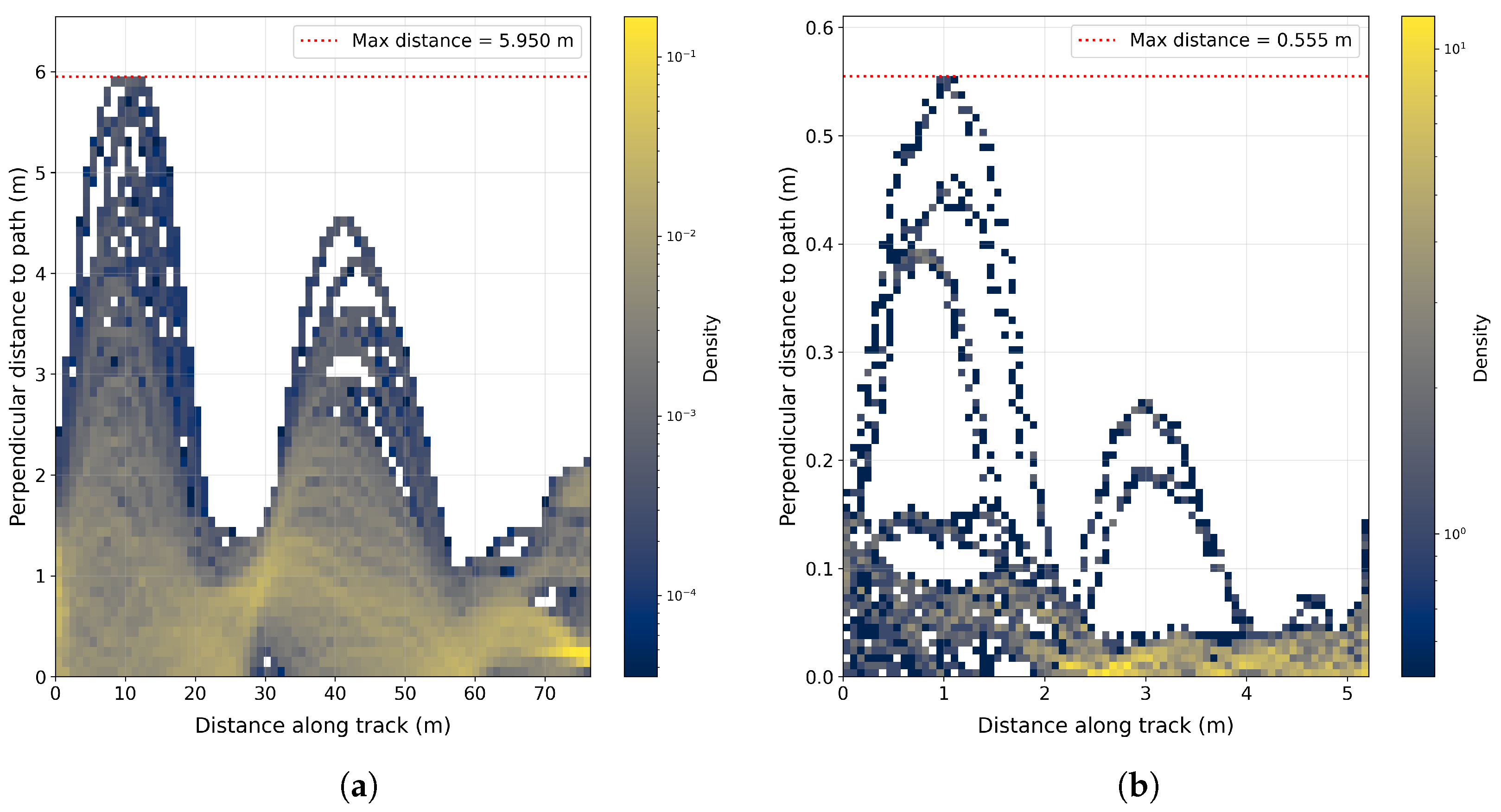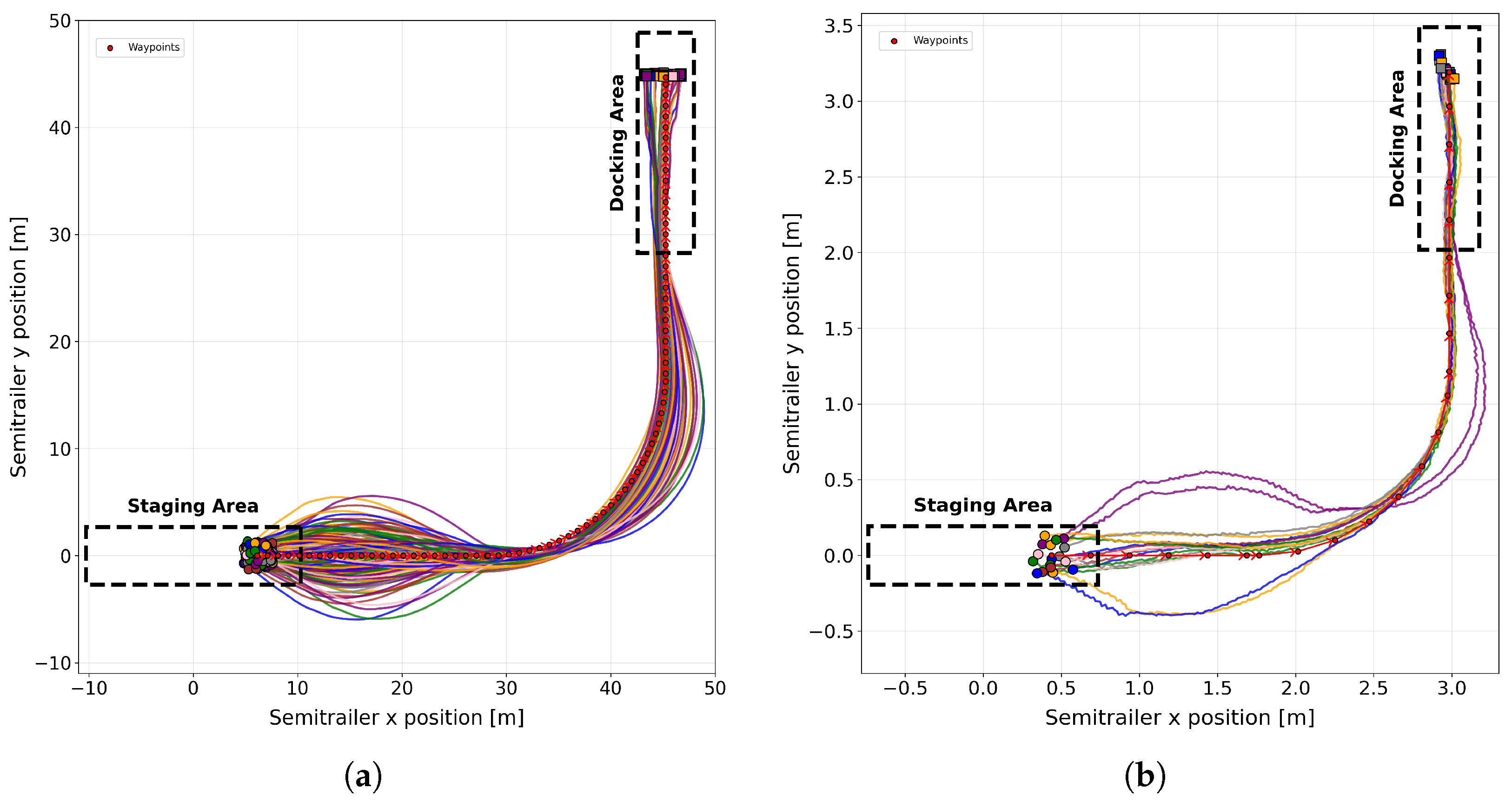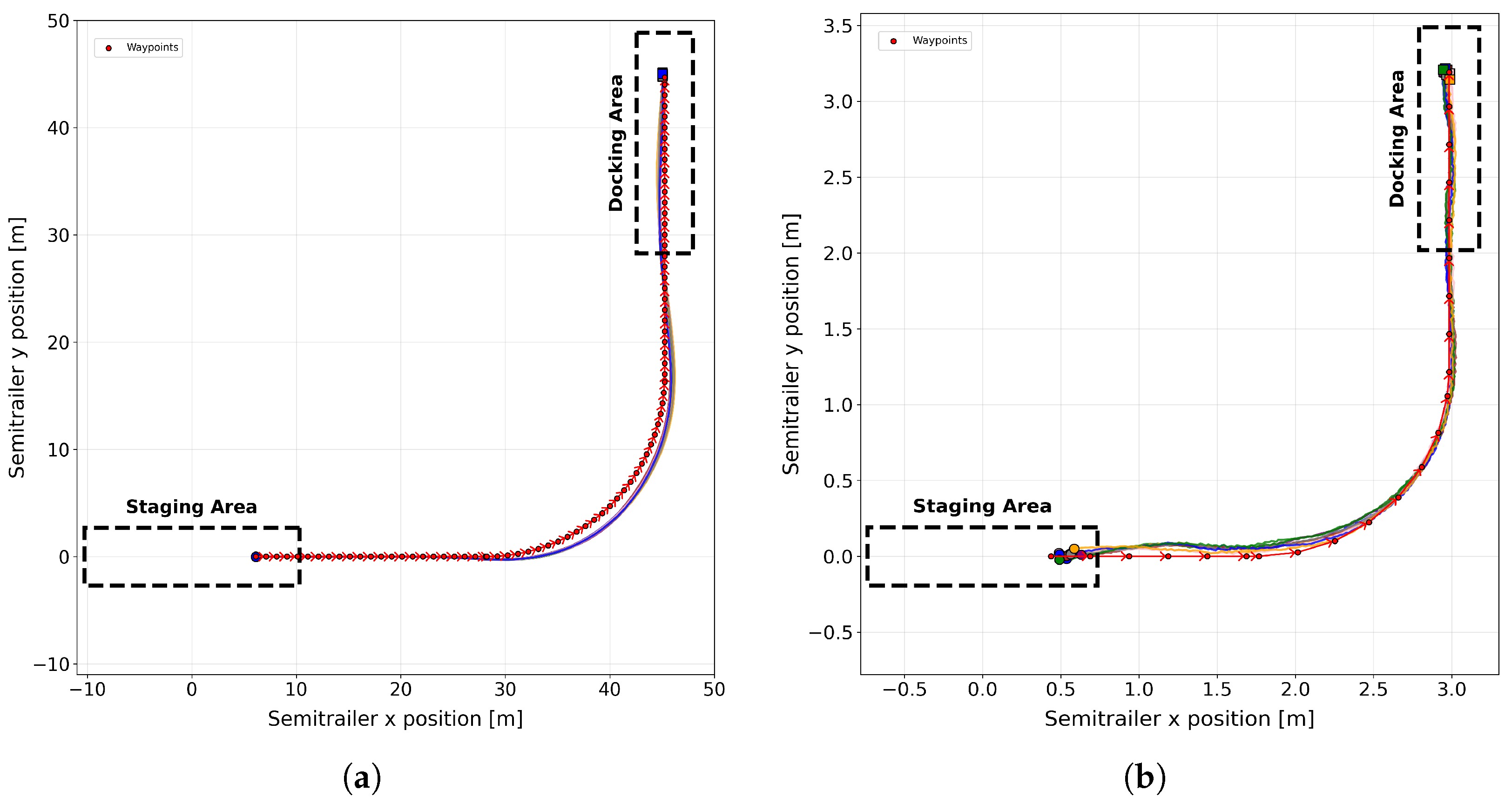 Figure 17 presents the results from 50 repeated tests in a simulation and 10 runs with the scaled truck with the nominal starting position in the staging area. It can be noted that the distribution of trajectories across runs is tightly clustered in both simulation and physical tests, indicating high precision in following the intended path when starting from the nominal position in the staging area.