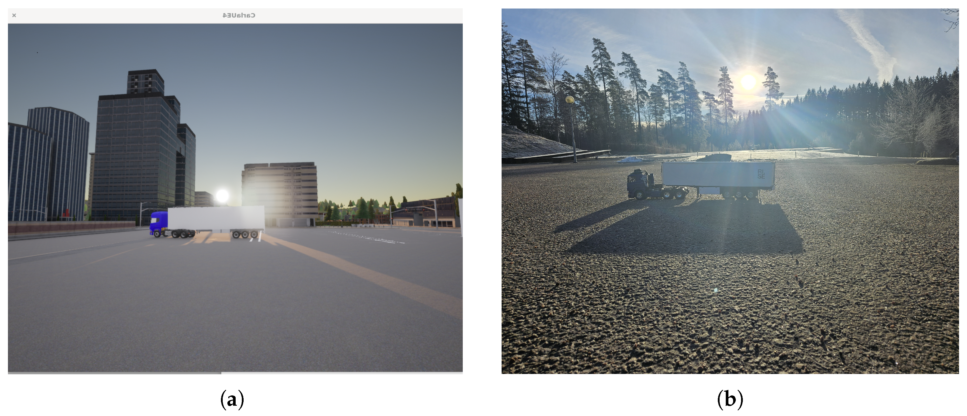 Figure 12 illustrates the customised CARLA environment with the imported truck–trailer model, performing a reversing manoeuvrer.