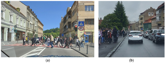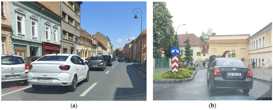 To ground this research in a real-world scenario, the city of Brașov, Romania, was selected as a case study. Brașov’s historic center, originating in the 14th century, retains its medieval street plan, which now serves as a major tourist destination and a critical transit zone for approximately 10,000 residents. The area contains roadways and intersections that are too narrow for conventional public or private transport, creating significant traffic bottlenecks and limiting mobility (Figure 1a—narrow streets, Figure 1b—Piața Unirii intersection).