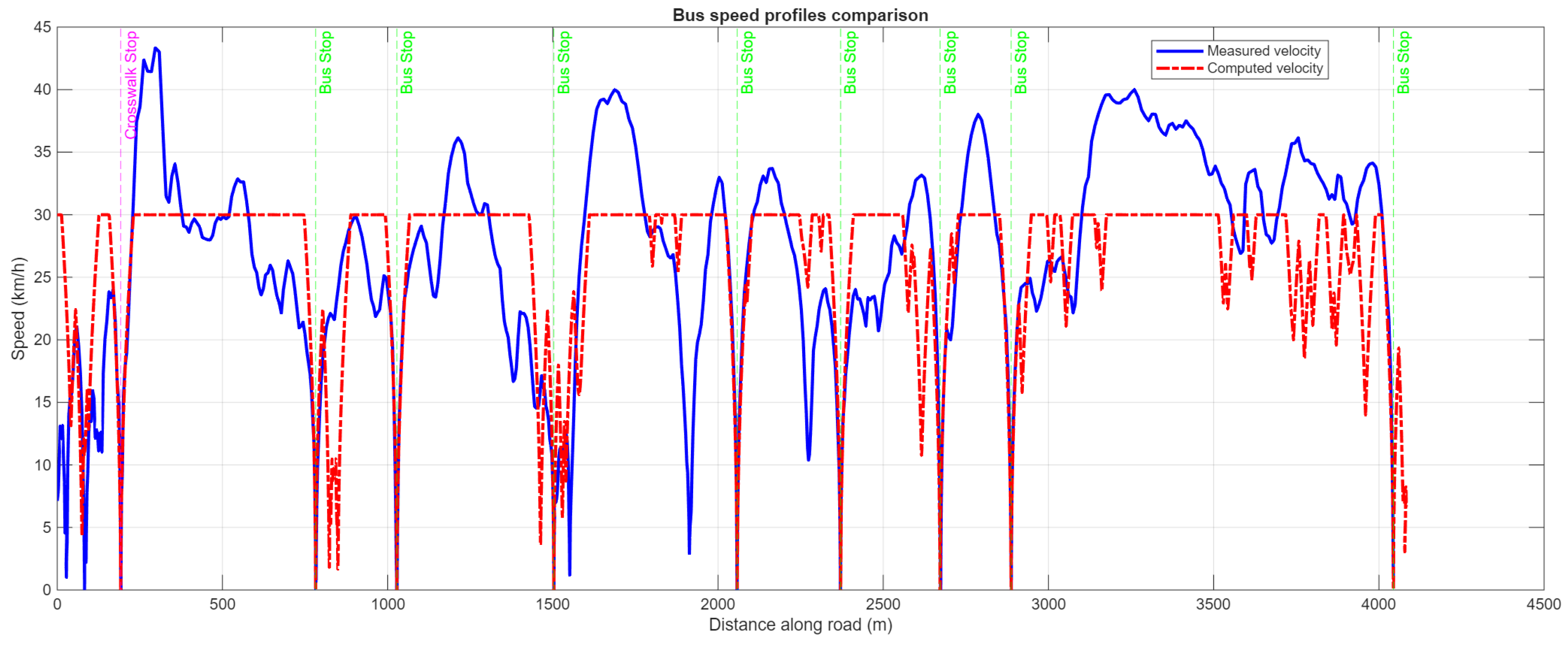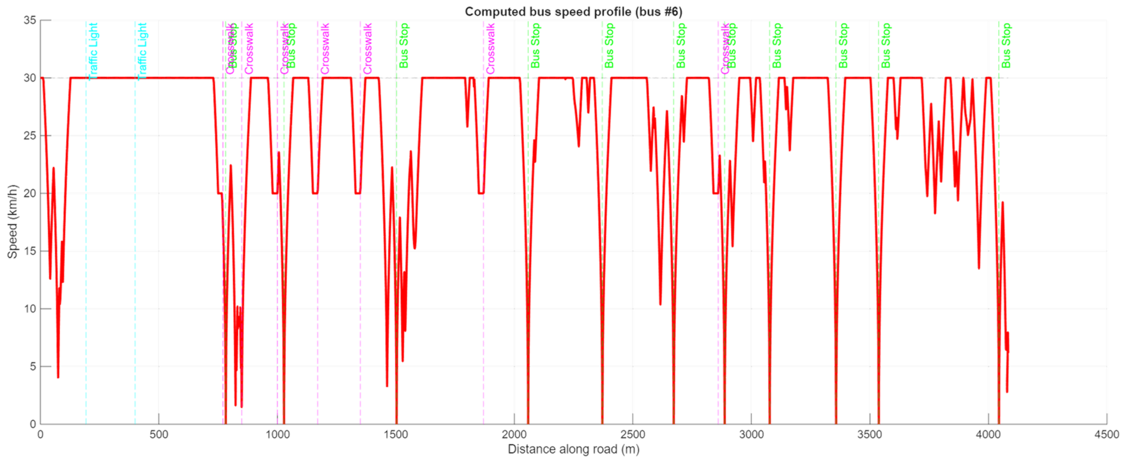 - Calculation of minimum travel time: The minimum travel time for each vehicle was calculated while strictly adhering to traffic laws, mandatory stops at stations, and the pre-defined passenger comfort constraints.