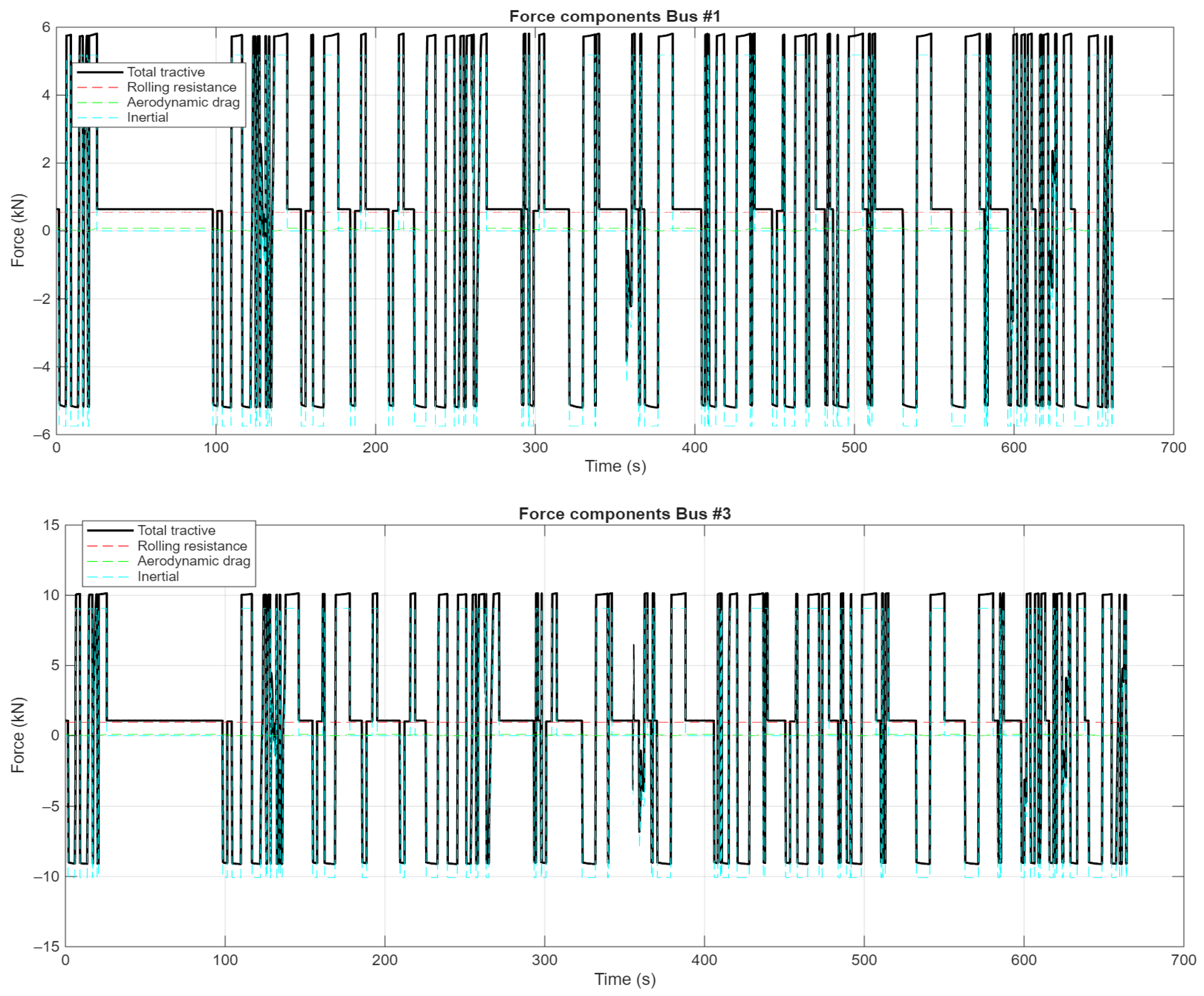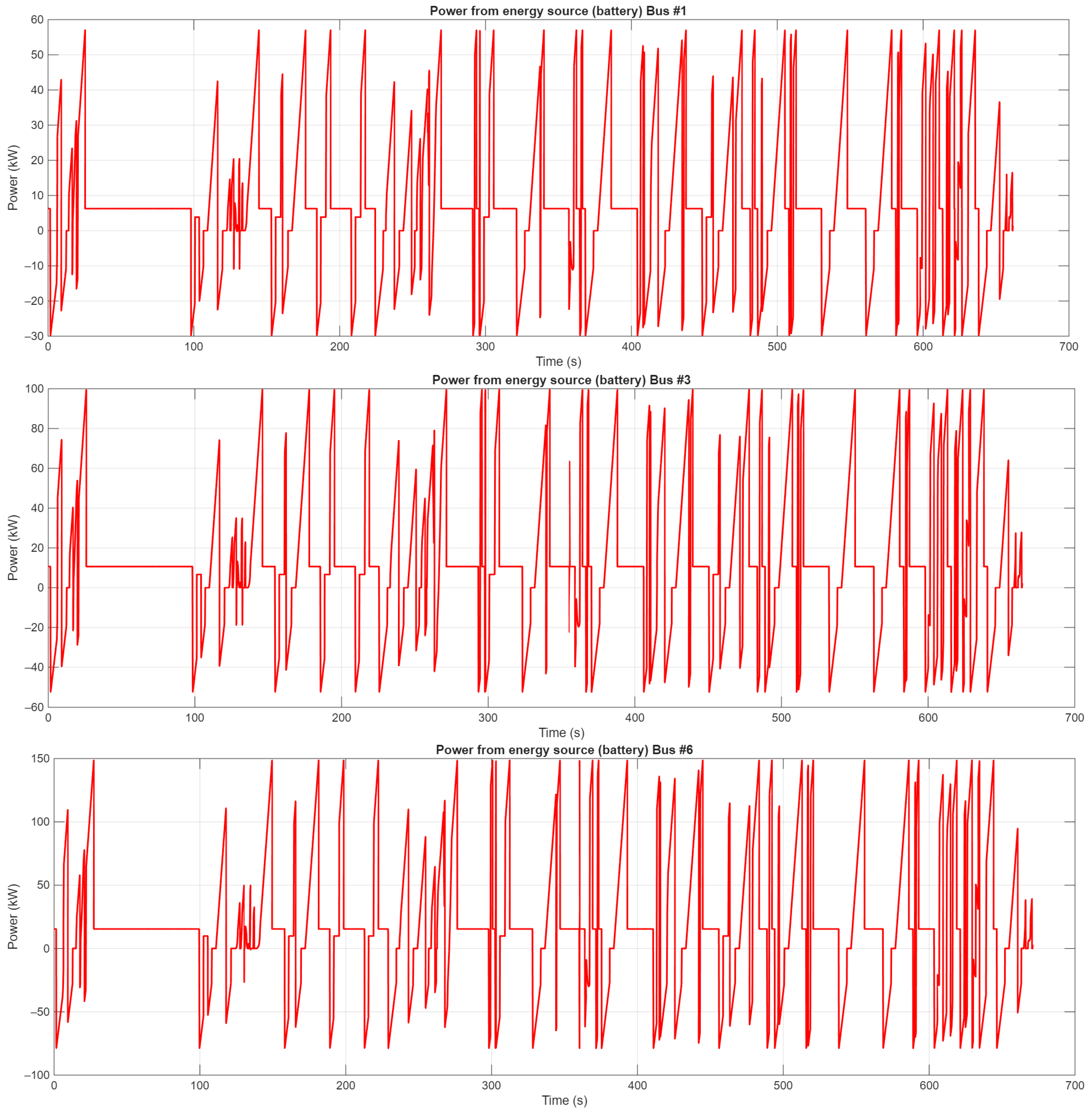 - Deceleration (=−1.0 m/s2): Similarly to acceleration, comfortable deceleration is critical. The LRT benchmark for comfortable deceleration is −1.34 m/s2 [76], while some energy consumption models for electric buses use a limit of −0.8 m/s2 [81]. A value of −1.0 m/s2 was selected as a balanced parameter that ensures a smooth, comfortable stop without being overly conservative.