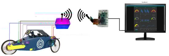 To address these shortcomings, the design, implementation, and field validation of a real-time telemetry and monitoring system (IoV based) for electric racing applications are presented. The architecture utilizes an ESP32 microcontroller for high-frequency data acquisition and a Raspberry Pi 4B for analytics and visualization through Node-RED, while LoRaWAN is used for long-range communication with low energy consumption. Field testing was conducted during the IV National Competition for Electric Traction Vehicles in Colombia, an event in which the team’s entry won the competition [9]. Under race conditions, a 12% increase in energy efficiency per lap was observed with telemetry-assisted driving [10]. These improvements were enabled by rapid feedback that supported optimized throttle modulation and regenerative braking, in line with prior studies reporting telemetry-linked performance gains on the order of 10–15%.