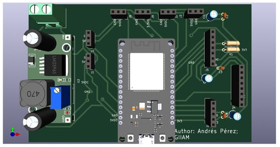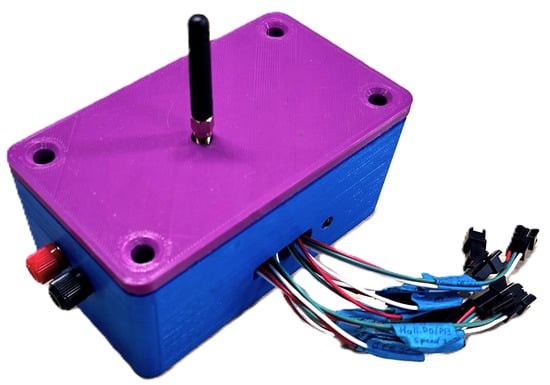 A custom printed circuit board (PCB) was designed in KiCad (Figure 2), while both the mechanical enclosure (Figure 3a) and its lid (Figure 3b) were modeled in FreeCAD and fabricated using 3D printing. The PCB was integrated into a blue 3D-printed enclosure (Figure 4) to improve mechanical fit, noise isolation, and thermal reliability. The system measured battery voltage and current, temperature, GPS-based velocity, controller temperature, and vehicle inclination. To reduce transmission load while preserving temporal fidelity, local filtering and fixed-point conversion were executed on the ESP32 prior to uplink. The assembled prototype (Figure 5) achieved at least Technology Readiness Level (TRL) 6 under competitive conditions.