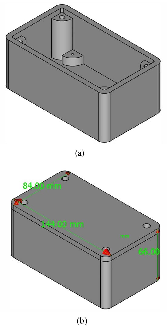 CAD renderings of the 3D-printed enclosure that protects the embedded telemetry electronics under race conditions. (a) Internal structure of the telemetry enclosure with mounting features and sensor compartments. (b) External sealed enclosure as used during track testing.