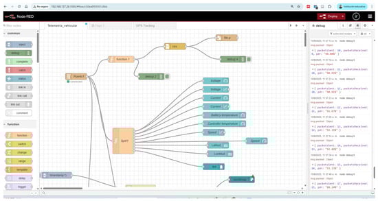 A key capability of the telemetry stack was its integration with Node-RED, an open-source, flow-based environment suited to Internet of Things (IoT) applications. Through this platform, real-time visualization and monitoring of critical vehicular variables were enabled, including voltage, current, speed, battery and controller temperatures, and GPS-based position. The dashboard was designed to surface actionable information to the race engineering team, so that tactical decisions could be supported during heats and richer analyses could be carried out afterward.