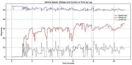 To evaluate the influence of telemetry on vehicle performance, energy-oriented indicators were derived from synchronized voltage and current signals acquired during each lap. Instantaneous electric power was computed as