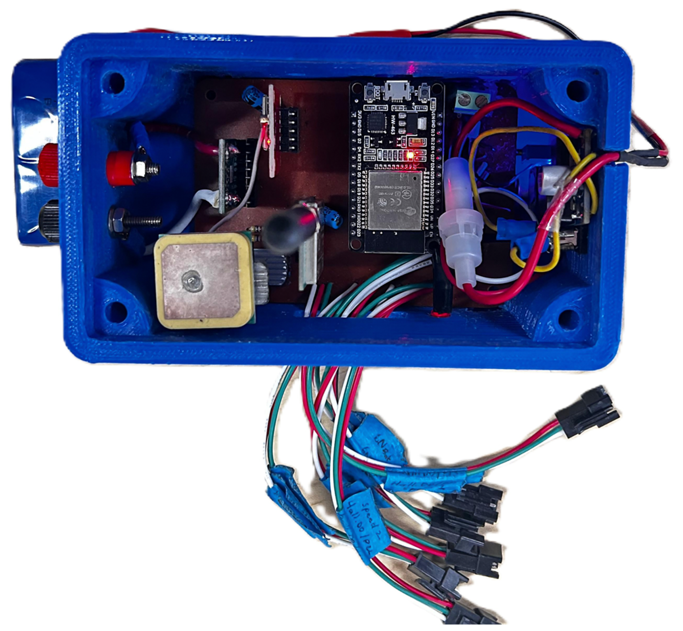 Figure 4) to improve mechanical fit, noise isolation, and thermal reliability. The system measured battery voltage and current, temperature, GPS-based velocity, controller temperature, and vehicle inclination. To reduce transmission load while preserving temporal fidelity, local filtering and fixed-point conversion were executed on the ESP32 prior to uplink. The assembled prototype (