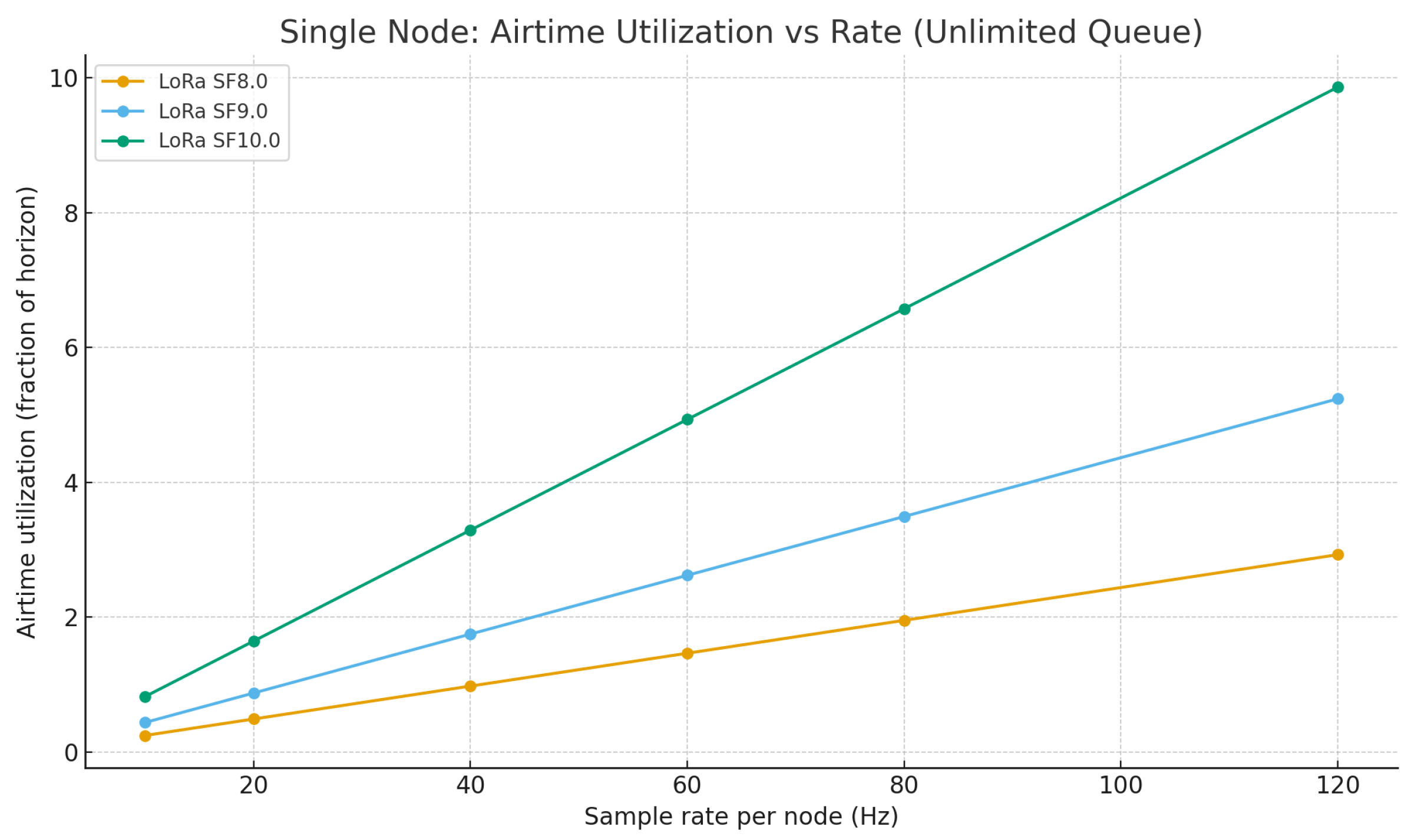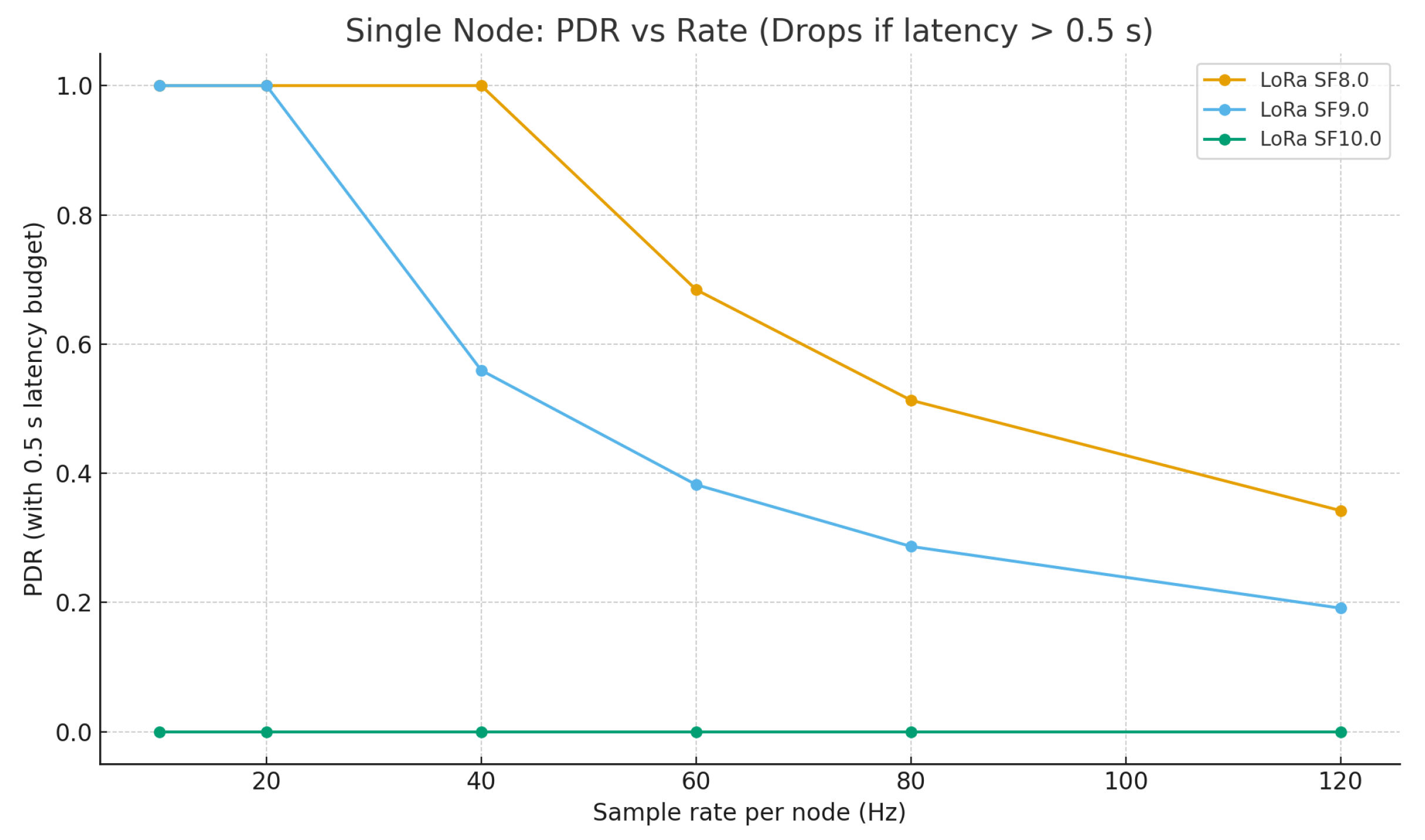 Table 5)—which bound update rates. In practice, this supports ≈20–60 Hz per-node sampling for a single node; in multi-node settings (≥4 nodes) above ≈20 Hz unslotted ALOHA collisions reduce PDR unless batching/channels/spreading-factor are optimized (