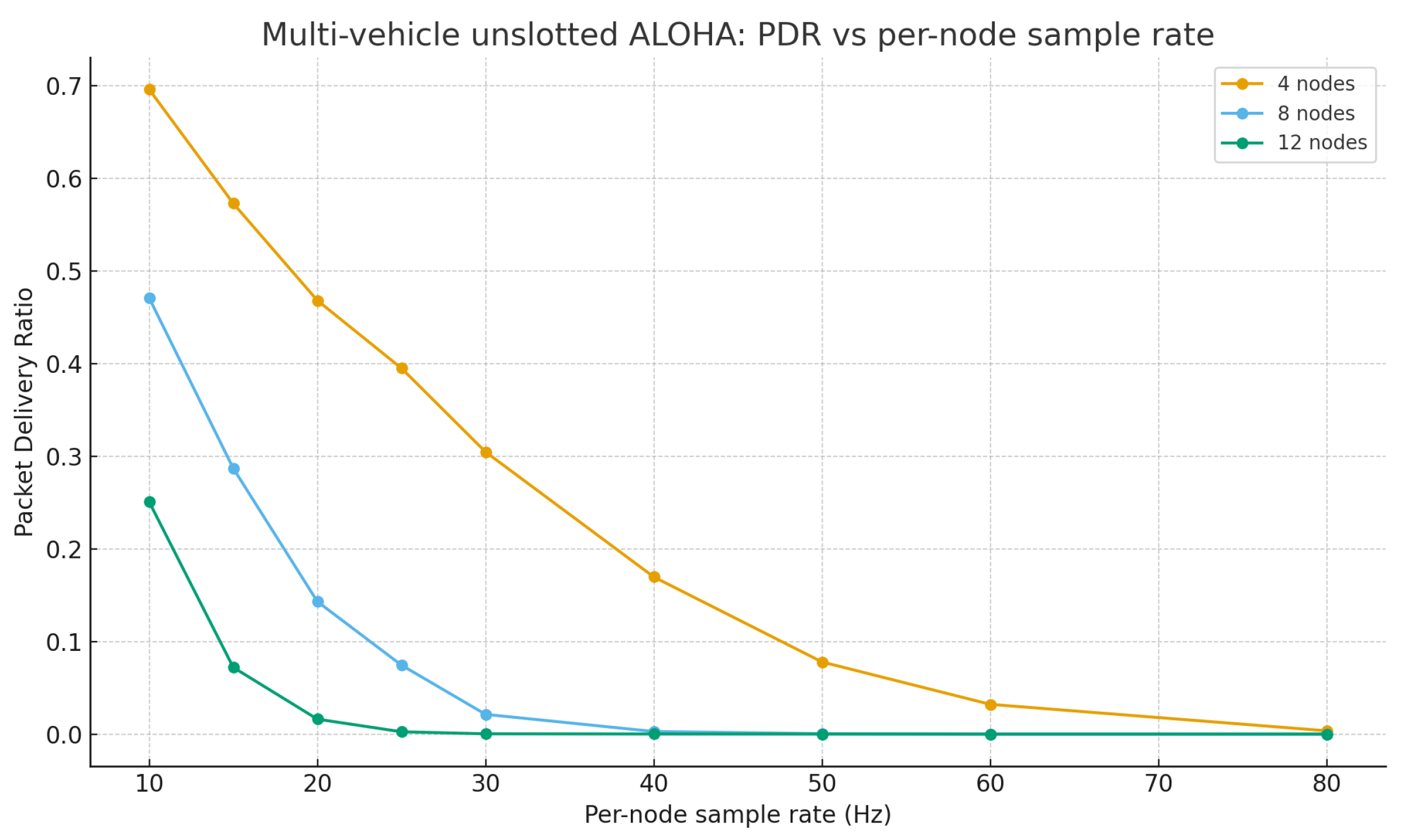 Supplementary S1) configured with our telemetry budget (≈28 B payload within a ≈50 B practical limit) and 20–60 Hz sampling, evaluating both a single-node/single-gateway case and a multi-node unslotted-ALOHA model. The simulations show that a single node is bounded by time-on-air and a 0.5 s real-time latency budget, whereas with ≥4 nodes above ≈20 Hz, unslotted-ALOHA collisions rapidly reduce PDR unless batching is increased, lower SF/shorter ToA is used, and/or more channels are provisioned. These findings bound the sustainable throughput of our current design and justify our plan for controlled multi-vehicle experiments. The manuscript now states explicitly that these are simulation results and summarizes their implications (see