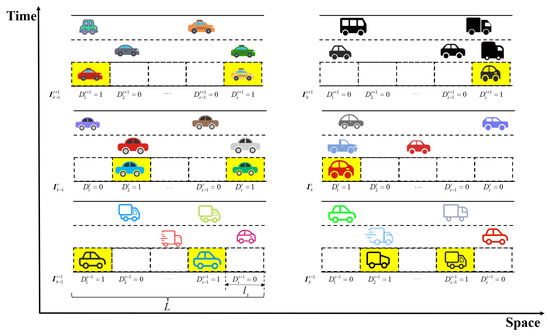 The control of emergency lanes on highways aims to determine the optimal times to open these lanes to enhance traffic efficiency and safety. The control strategy specifies the start point and length of the segment where the emergency lane should be opened, thereby improving traffic conditions in congested or accident-prone areas. As illustrated in Figure 1, the control segments are spatially discretized into segments s of approximately equal length, with each segment ranging from 200 to 400 m. Temporally, the control duration T is divided into 10-min intervals , during which the status of each segment remains constant. A binary variable represents the status of the emergency lane for the -th segment: indicates the lane is open, and indicates it is closed.