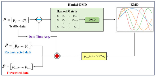 In this context, is a diagonal matrix with elements . , where is the eigenvectors. , where is the Moore-Penrose pseudoinverse of . The Hankel-DMD algorithm [15] generates mode-eigenvalue pairs . These pairs can be evolved over t time steps using Equation (13) to reconstruct the data. Extending this evolution beyond t steps enables the prediction of future system states. A visual representation of the procedure is provided in Figure 3.
