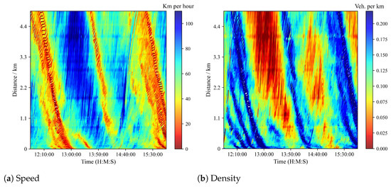 To analyze traffic flow parameters, we generated time-varying heatmaps that illustrate speed and density fluctuations, as shown in Figure 7. In Figure 7a, which represents speed data, the color scale ranges from red (low speed) to blue (high speed), measured in kilometers per hour (km/h). The x-axis represents time, and the y-axis represents distance along the road. The heatmap indicates that during peak hours, there is a significant reduction in average vehicle speed across all observation points due to heightened congestion, as reflected by the predominance of red areas. Conversely, off-peak hours, characterized by fewer vehicles and lower densities, exhibit higher speeds, indicated by blue areas, signifying improved traffic flow efficiency. Figure 7b displays the density data, with a color scale ranging from red (low density) to blue (high density), measured in vehicles per kilometer (Veh./km). The axes are the same as in Figure 7a. During peak hours, vehicle density escalates substantially at all locations, as indicated by the prevalence of blue areas. Off-peak hours, marked by dispersed vehicle travel, show lower density, represented by red areas. Unforeseen events, such as road construction, also influenced vehicle density; for example, an hour before the fourth observation point, there was a sharp rise in local vehicle density due to ongoing construction activities, underscoring the significance of real-time monitoring and prompt responses. This pattern highlights the interdependence between vehicle density and speed, where lower density facilitates swifter and more effective vehicular movement.
