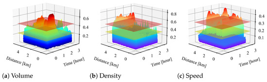 Figure 8 provides a visualization of the eigenvalues of the Koopman operator, which is instrumental in elucidating the dynamic traffic patterns over time and distance. The x-axis denotes time in hours, the y-axis represents distance in kilometers, and the z-axis illustrates the distribution of eigenvalue parameters, categorized into three distinct layers by two horizontal planes. The upper layer, characterized by a prominent red peak, corresponds to SST, indicating periods of high average speeds and minimal congestion. During SST, traffic flows efficiently with few disruptions, enabling vehicles to maintain consistent speeds and safe distances. The middle layer, marked by several smaller peaks, represents MSBDC. This layer signifies scenarios where multiple dispersed bottlenecks occur simultaneously, leading to widespread congestion and reduced overall traffic efficiency. The lower layer, more uniform in appearance, is AOC, characterized by periodic fluctuations in traffic speed with more frequent decelerations than accelerations. AOC indicates that during these periods, traffic flow is less efficient, with vehicles frequently slowing down or stopping, often due to minor disturbances when traffic volume approaches road capacity.