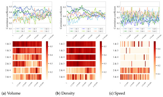 Identifying periods of strong correlation not only elucidates the temporal propagation of traffic conditions but also provides a critical foundation for real-time congestion prediction and informed decision-making regarding the activation of emergency lanes to alleviate potential bottlenecks. To investigate the dynamic interrelationships among traffic parameters at various observation points over time, we analyzed the time-lagged correlations of traffic volume, density, and speed, as illustrated in Figure 9. Specifically, the traffic volume at Observation Point 1 immediately influences Observation Point 2, affects Observation Point 3 after a two-minute delay, and significantly impacts Observation Point 4 approximately five minutes later. The density at Observation Point 2 affects Observation Point 3 after four minutes and has a pronounced effect on Observation Point 4 around seven minutes later. Additionally, the speed at Observation Points 2 and 3 exerts an intermittent impact on Observation Point 4 within a one-to-ten-minute window.