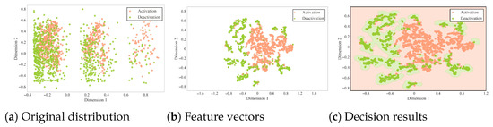 In Figure 10a, the original data distribution exhibits a non-linear and indistinguishable nature due to overlapping multimodal patterns, which introduces ambiguity in distinguishing activation from deactivation states. This complexity arises from the inherent multimodal characteristics of traffic data, where various factors such as traffic volume, density, and speed intertwine in non-linear ways. Traditional decision-making approaches struggle to model these intricate relationships directly, as linear classifiers or threshold-based methods cannot disentangle the entangled feature space, leading to suboptimal or unstable decisions. However, upon applying KMD and GM for feature extraction, the feature vectors depicted in Figure 10b become markedly more distinguishable. KMD identifies and extracts meaningful features from multimodal traffic data, revealing underlying patterns that were previously obscured. These patterns are subsequently processed by GM, which maps them into a space where the deactivation and activation states are more clearly separated. This transformation is crucial for enhancing both the interpretability and accuracy of the decision-making process. Figure 10c visualizes the decision results obtained by combining the KMD-extracted traffic patterns with the output of GM. The clarity of the “activation” and “deactivation” distributions in Figure 10c can be attributed to the effective feature extraction and transformation process. KMD initially disentangles the complex data distribution by identifying key traffic patterns, while GM further enhances the separability of these patterns in the transformed space. Consequently, this results in a decision boundary that accurately distinguishes between different states, making the decision results more interpretable and reliable. The IDM leverages these inputs to formulate optimized decisions concerning emergency lane control. By framing the control of emergency lanes as a binary classification task, the IDM predicts the necessity for activation or deactivation based on the extracted features. The integration of fuzzy rule outcomes with KMD-recognized traffic patterns enables context-sensitive and holistic decision-making, ensuring both robustness and interpretability. This comprehensive approach enables the IDM to consider multiple factors simultaneously, including real-time traffic conditions, historical data, and traffic patterns, thereby leading to more informed and adaptive decisions.
