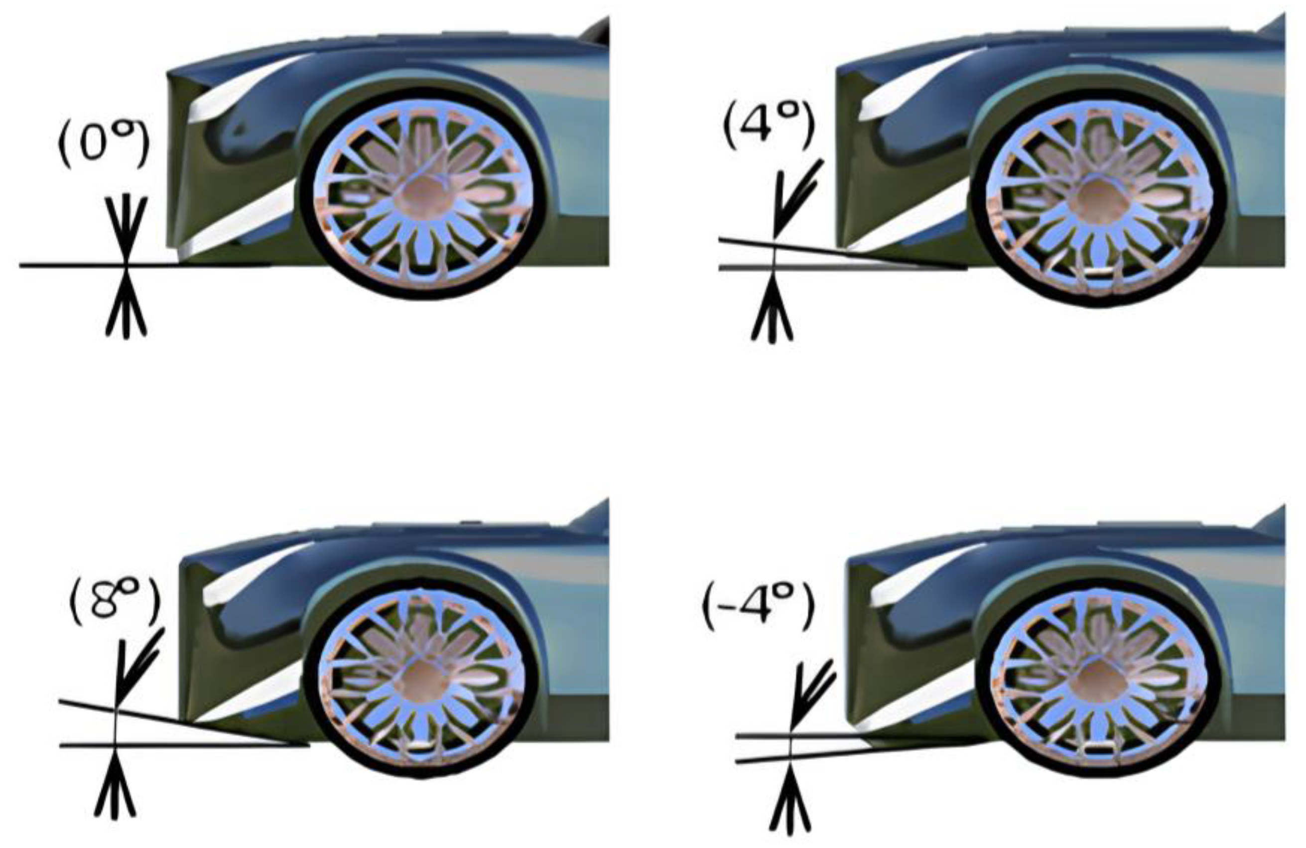 A first set of CFD calculations was performed on four different front bumper set-ups of the angle (−4°, 0°, 4°, 8°). Every configuration had characteristic aerodynamic tendencies. The −4° gradient decreased the lift but gave increased drag (Cd = 0.29), whereas the 0° angle gave a neutral but less than ideal flow (Cd = 0.27, Cl = 0.029). The angle (4°) became best because it has the least amount of drag (Cd = 0.26) and controlled lift (Cl = 0.030). On the other hand, the 8° angle produced an increased lift (Cl = 0.033) and drag (Cd = 0.28), which adds compromise to vehicle stability.