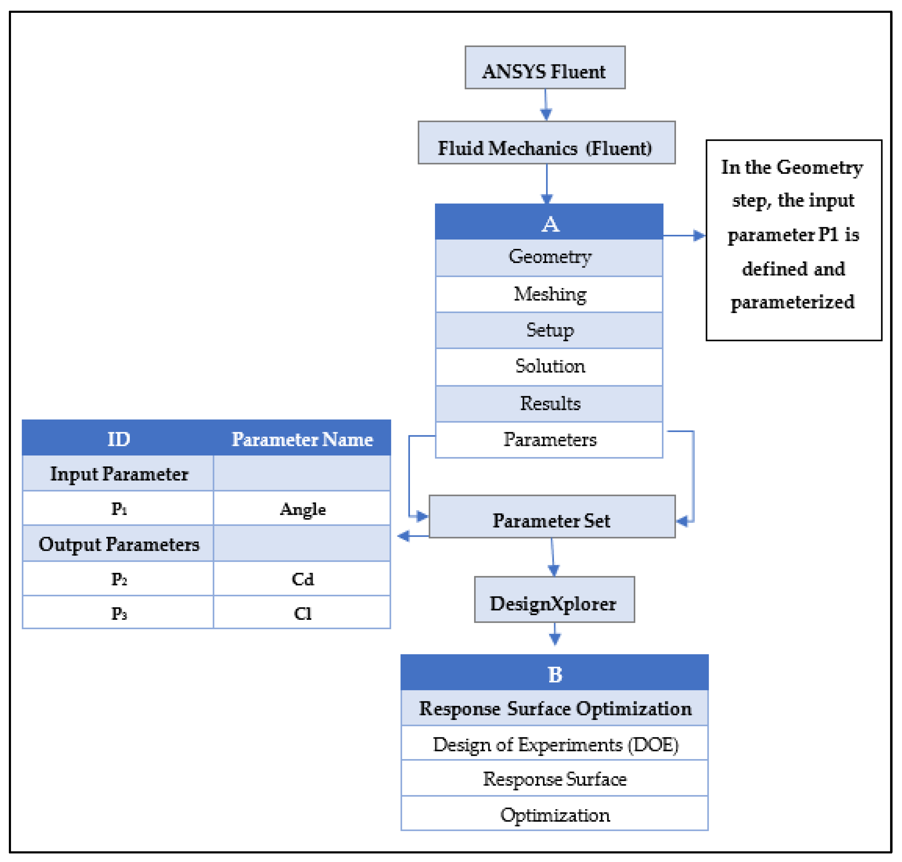 18] suggests an organization of parametric optimization of aerodynamic shapes in ANSYS DesignXplorer and Fluent. Modifiable parameters of geometric properties are defined through quantification of the individual properties and construction of response models is performed by simulating various configurations with the use of a design of experiments (DoE). This multi-objective-based method is most effective in terms of reducing drag and managing lift and fewer simulations are needed in this compared to the conventional way of doing it and so the overall performance of the aerodynamics is also optimized.