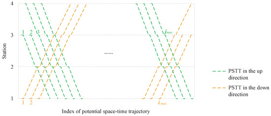 To achieve this goal, we first discretize the given time horizon at a specified granularity, and then describe the potential space-time trajectories (PSTTs) of trains at each discretized time point as demonstrated in Figure 2. Within this framework, the joint optimization of the full-length and short-turning plan and schedule attempts to simultaneously address the following three sequential decision-making processes: (1) selecting which PSTTs to incorporate into the train operation plan; (2) determining whether these trajectories should be full-length or short-turning; (3) assigning passengers to the trains.
