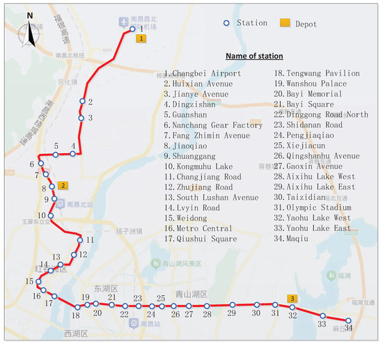 Nanchang Metro Line 1 officially commenced operations in December 2015. In February 2022, it was approved to initiate the construction of the east extension and the airport extension projects, which are planned to be fully connected by the end of June 2025. The entire line features 34 stations, spans a total length of 50.17 km, and is equipped with three depots: Changbei, Jiaoqiao, and Yaohu. Figure 3 shows the specific route and station distribution.