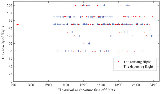 As this study specifically focuses on the influence of flight information on metro operations, Figure 4 depicts the regular flight distribution at Changbei Airport. In this figure, the horizontal axis denotes the flight arrival or departure, while the vertical axis indicates the flight capacity. The flight-related information serves as a foundation for the subsequent demand forecasting at the Changbei Airport metro station. To guarantee the stability of the demand-supply equilibrium, it is assumed that all regular flights and the metro trains on the airport line adhere strictly to their scheduled timetables.