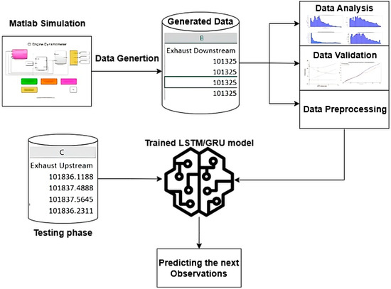 Figure 1. The process begins with data generation using a MATLAB engine simulation model, which produces a synthetic dataset representing various engine parameters under different operating conditions. This dataset is free of missing values and class imbalance, ensuring clean input for model training. The dataset is then subjected to data analysis, validation, and preprocessing steps, including statistical inspection, feature scaling using z-score normalization, and sequence generation using a sliding window of 30-time steps. The preprocessed sequences are used to train deep learning models based on LSTM and GRU architectures. Each model includes two recurrent layers with tunable hyperparameters such as the number of units, activation functions (ReLU, Tanh, ELU), dropout rates, and batch size. Training is performed using the Adam optimizer, with Mean Squared Error as the loss function, and a grid search strategy is applied to optimize the architecture. After training, the models are evaluated on a separate test set to assess generalization performance. Finally, the trained models are deployed to predict the next observations in the time series, enabling accurate forecasting of engine behavior.
