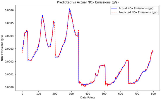 x emissions (g/s), showing how closely the GRU model predictions align with the true values over time.