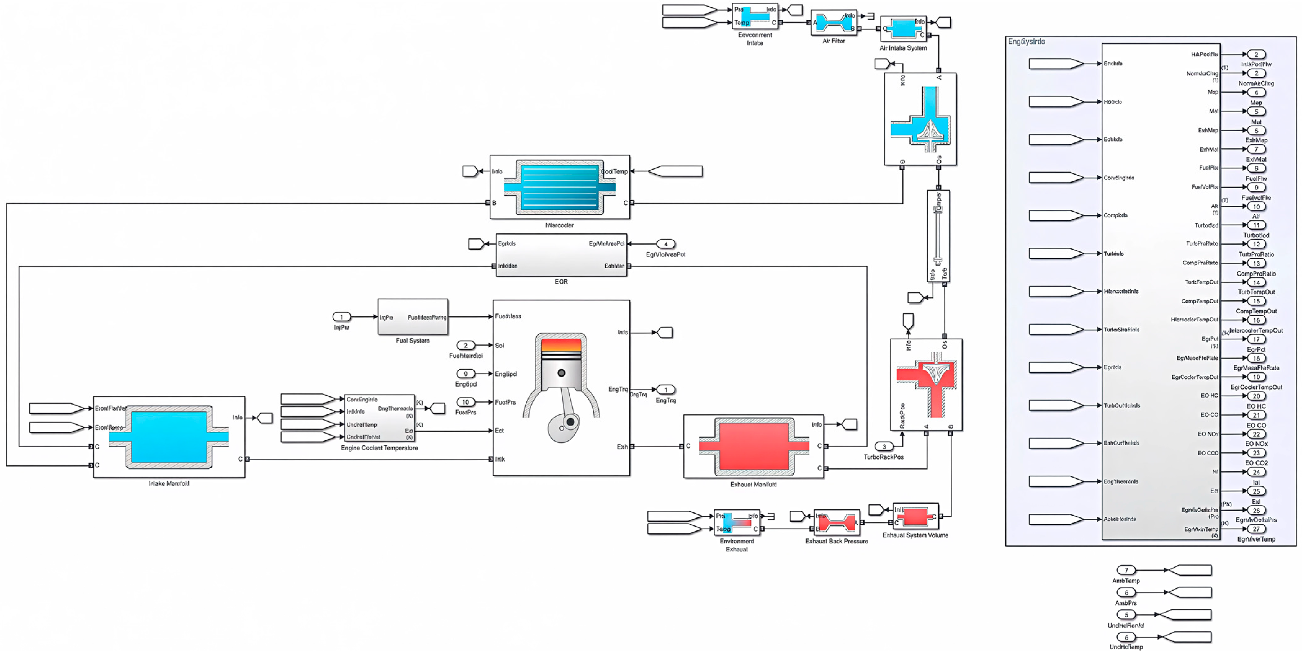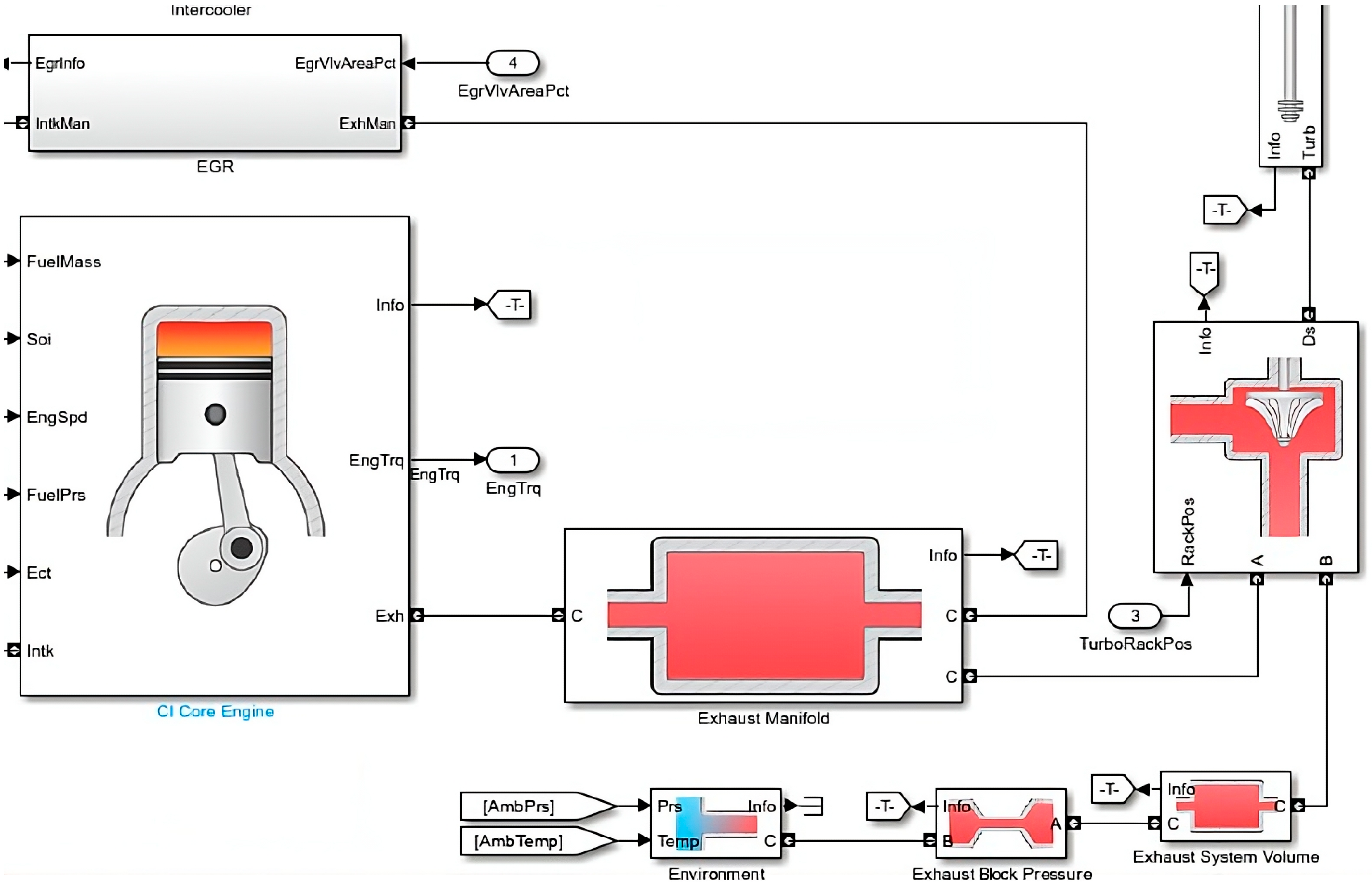 The second phase focused on using MATLAB, specifically the “Powertrain Blockset,” to model the engine and its associated systems. Using an existing example (“CI Dyno Reference Application”), sensor data relevant to the powertrain, including pressure and temperature sensors, was generated. Modification of the EBP orifice size enabled the observation of how variations in backpressure influence engine performance.