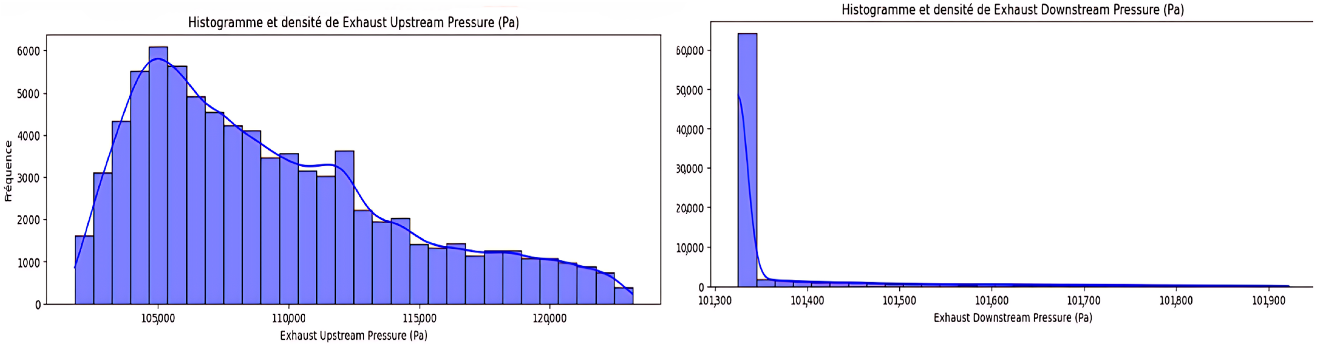 The data generation subphase covers the use of MATLAB-based simulation models to generate synthetic EBP data, comparing MATLAB-generated data with literature values and industry-standard tools like Ricardo-Wave, analyzing key influencing parameters, and validating simulation outputs against real-world observations. This integrated approach ensures robust predictive modeling of EBP effects, combining real sensor data with synthetic augmentation to enhance model accuracy and reliability. The second phase of the methodology employs comprehensive data science practices to model, preprocess, and analyze engine parameters using deep learning architectures. It consists of three main components: exploratory data analysis of 79,919 observations across 23 engine parameters, we selected signals that are physically linked to exhaust backpressure dynamics, meet minimum signal-quality thresholds (rate, range, missingness), reduce redundancy after correlation screening, and are practical for edge inference. The final set was reviewed and approved by two powertrain experts. Data preprocessing and partitioning, and implementation of recurrent neural network models with optimization. The first component focuses on understanding the distribution characteristics of key variables such as Exhaust Upstream Pressure, Exhaust Downstream Pressure, and emissions, revealing significant asymmetries and multimodal behaviors that necessitate advanced modeling approaches beyond traditional statistical methods. The second component involves standardizing features using z-score normalization to ensure numerical stability, partitioning data into training (80%) and testing (20%) sets, and preparing the dataset structure for sequential analysis, thereby establishing a foundation for robust model development. The third component covers the implementation of LSTM and GRU architectures, systematic hyperparameter tuning through grid search optimization, and evaluation of model performance based on validation loss metrics, with the optimal GRU configuration achieving 0.0011 validation loss and the LSTM architecture reaching 0.0184. Each component is designed to ensure accurate prediction of engine parameters, combining exploratory analysis with advanced deep learning techniques to enhance model reliability and practical applicability for engine maintenance optimization.