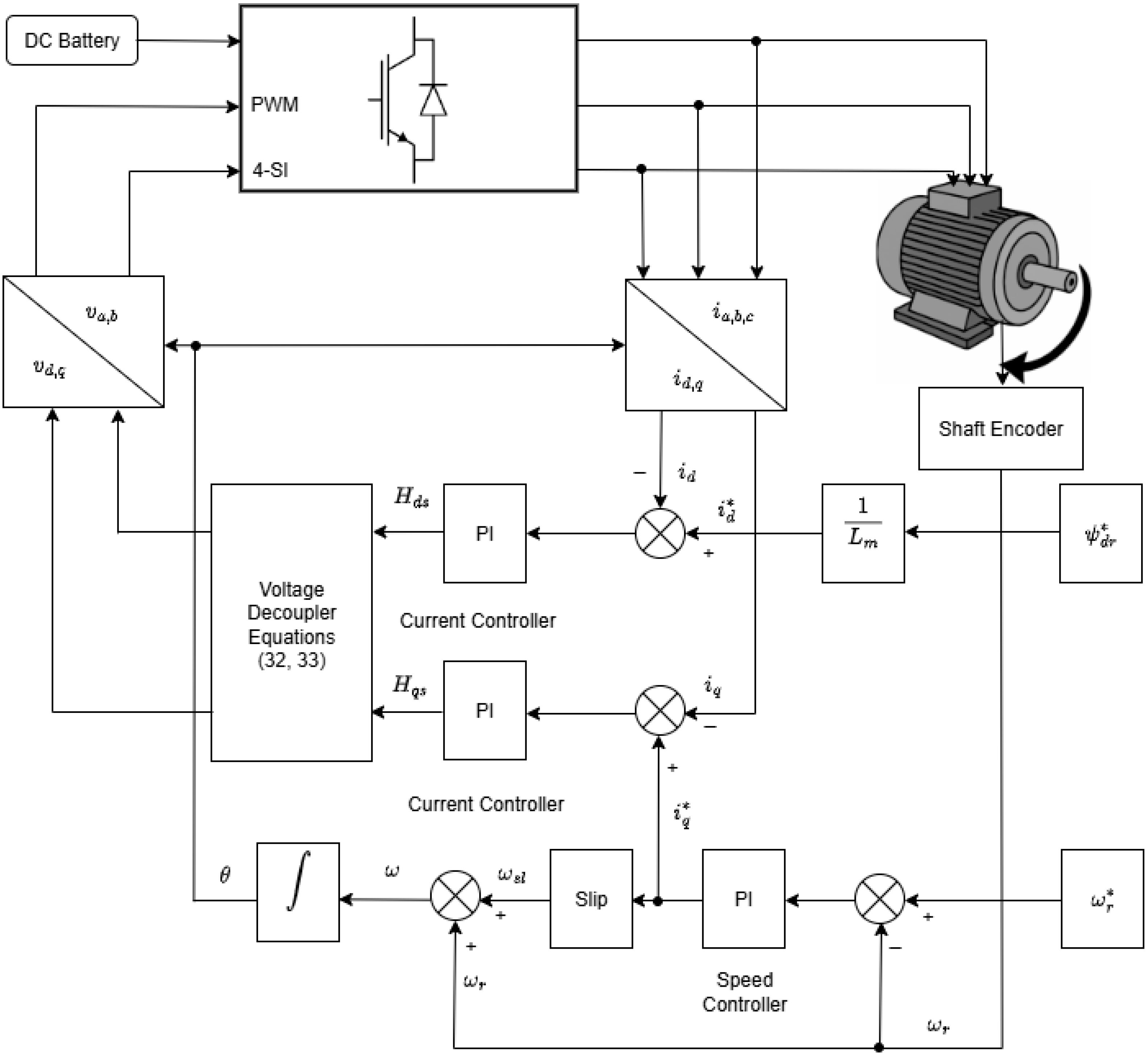 Under healthy operating conditions, the EV’s induction motor drive employs a standard VC, to achieve high performance speed and torque regulation. The VC technique transforms the three phase stator currents into the rotating dq reference frame using the Clarke–Park transformation, allowing decoupling of the torque producing and flux producing components. This decoupling is essential for precise control, enabling independent adjustment of rotor flux and electromagnetic torque.