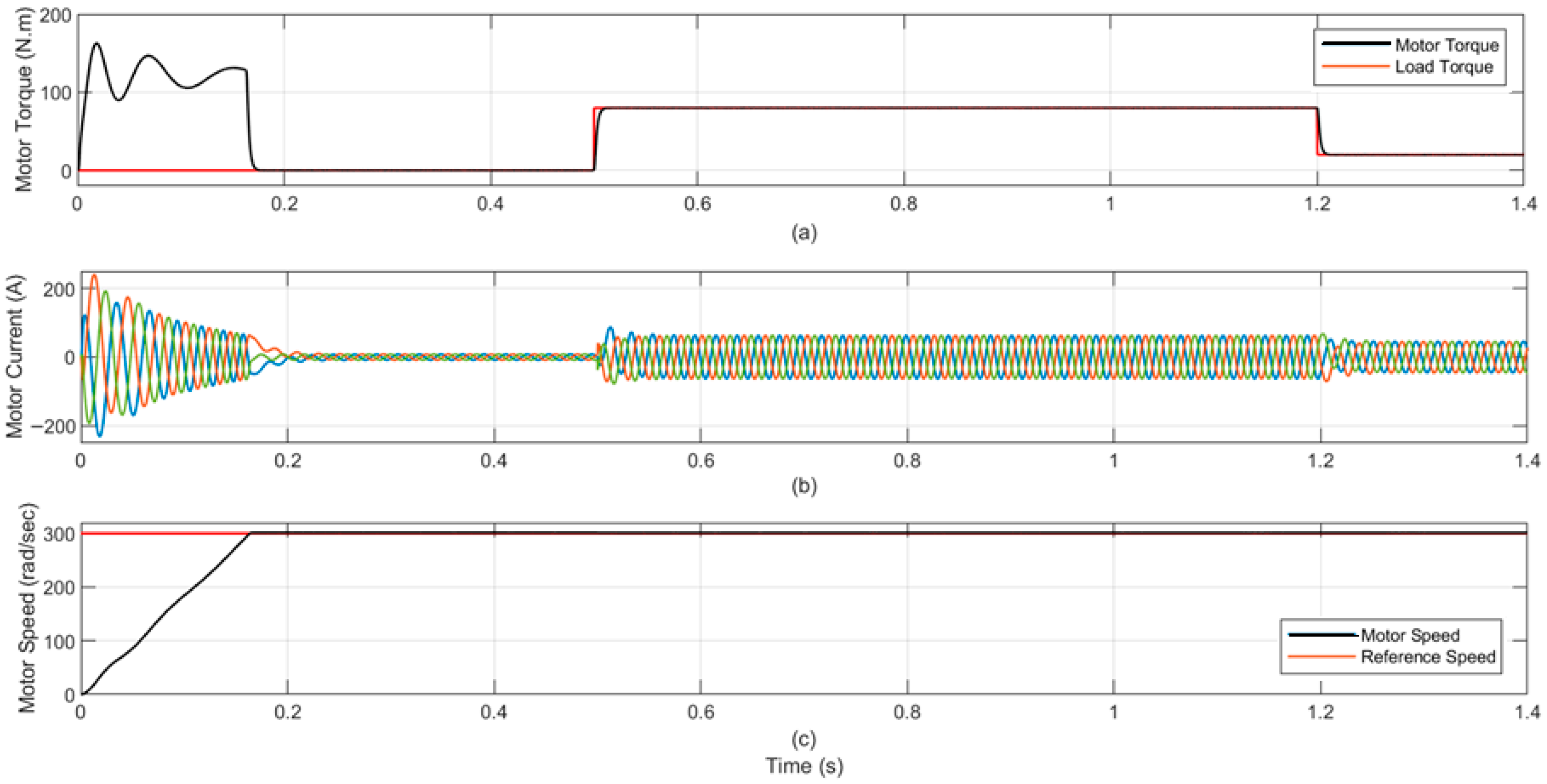 Table 3 presents the key electrical and mechanical parameters of the induction motor, including stator and rotor resistances, inductances, and the moment of inertia. Datasets of industrial-grade traction motors are used in deriving these parameters and they are verified through comprehensive MATLAB (version 2023b)/POWERSIM simulations. The inverter switching frequency was set to 10 kHz, which is an optimized value for IGBT-based traction converters in the power range of 30–50 kW.