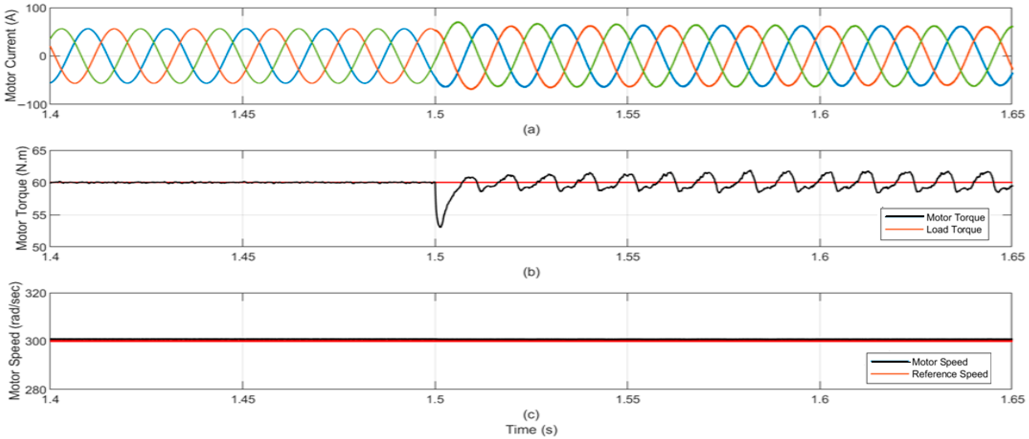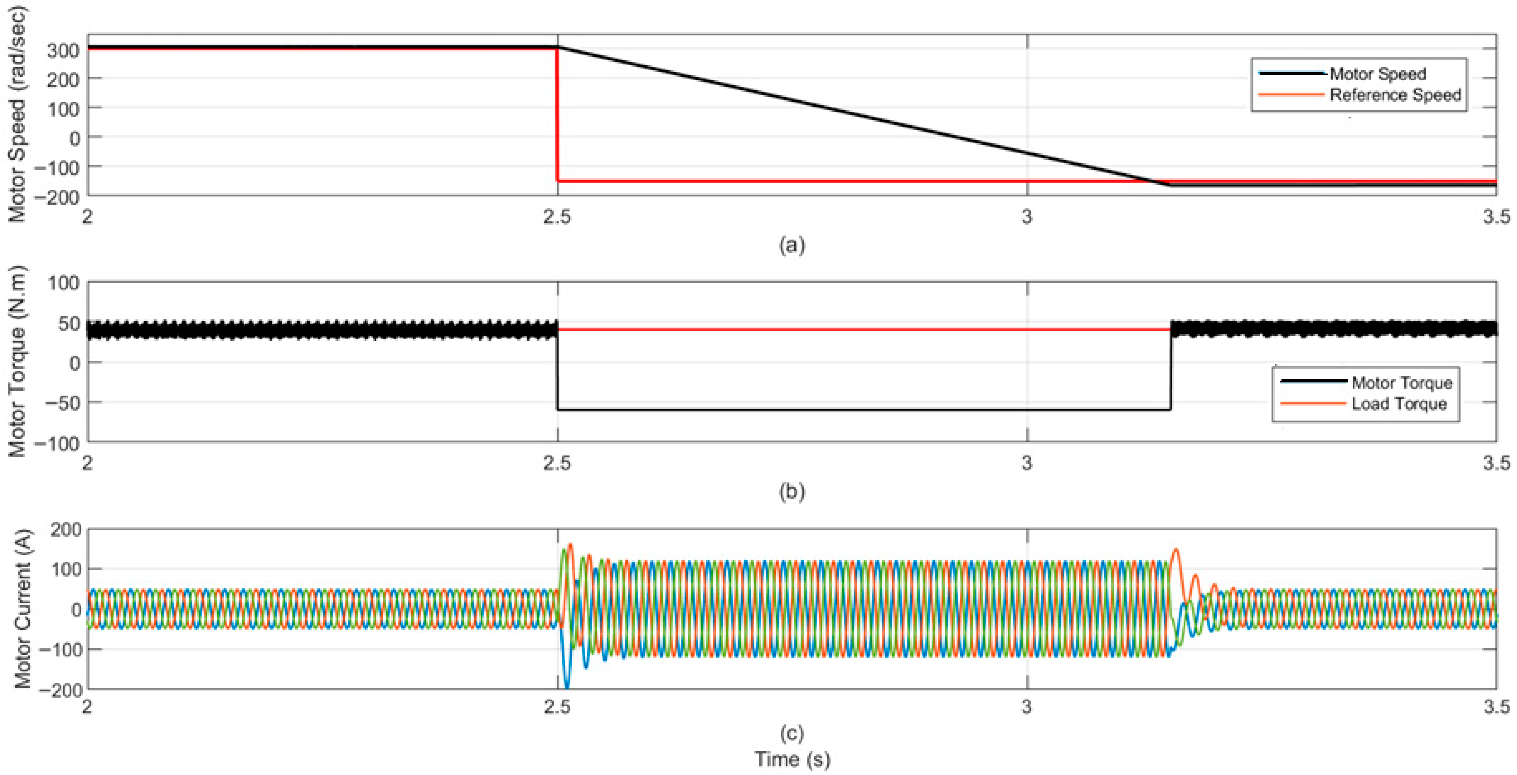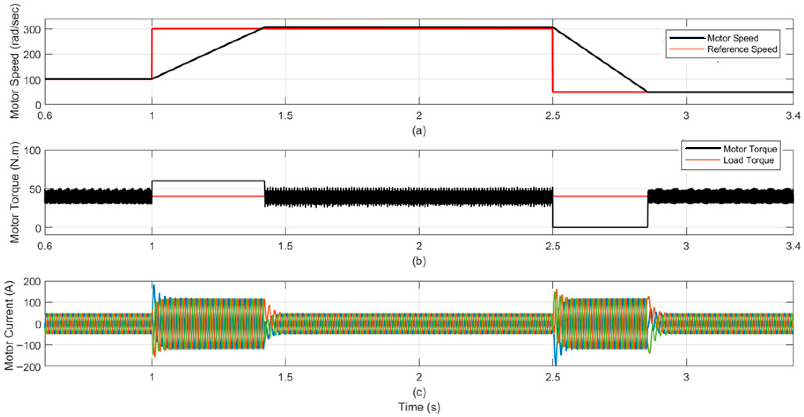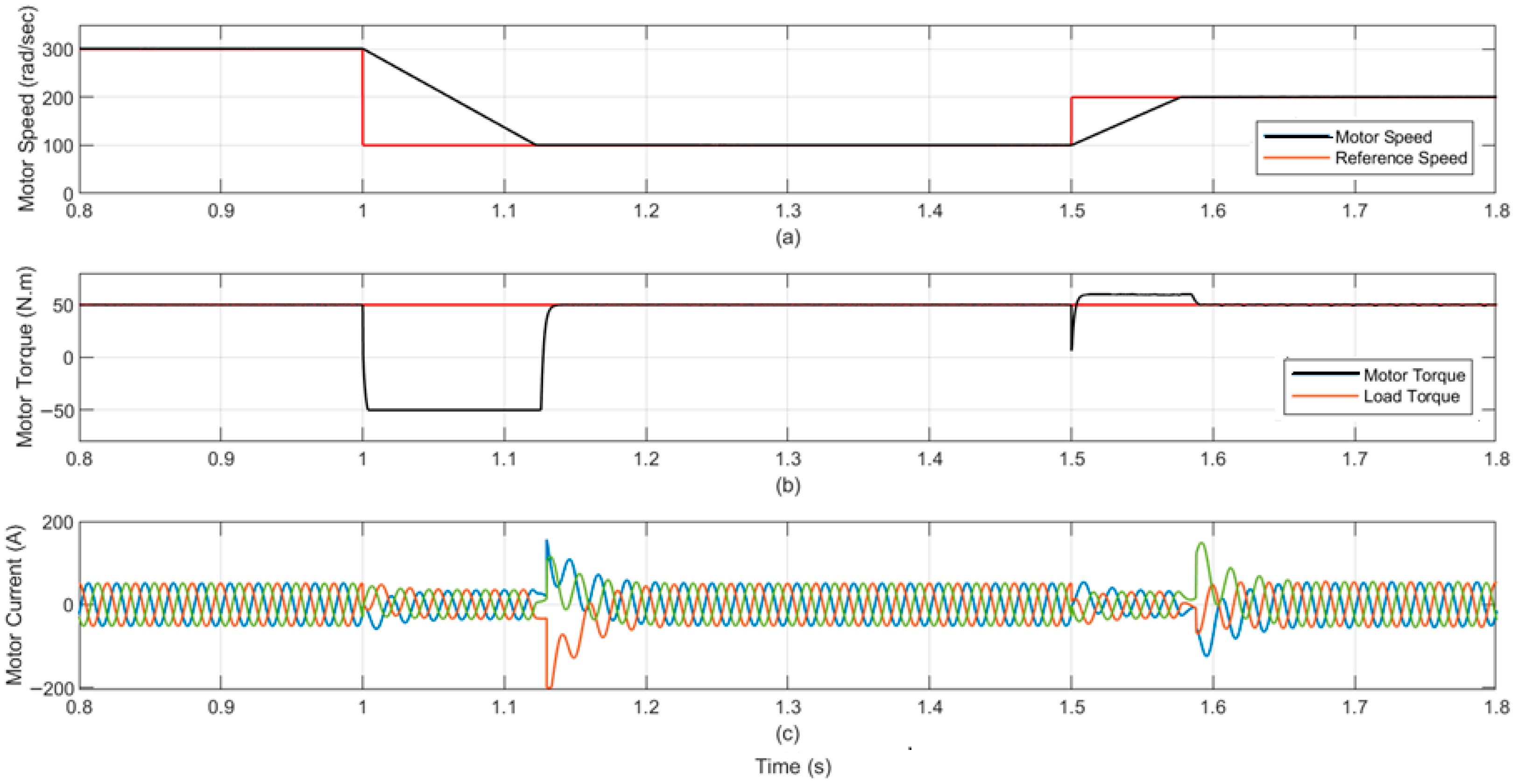 Figure 7, assessed how well the proposed system handled speed changes. At t = 1 s, the speed drops from 300 rad/s to 100 rad/s. Then, at t = 1.5 s, it increases to 200 rad/s. Both tests consistently displayed smooth current, torque, and speed profiles, confirming precise torque production and a swift speed response throughout.