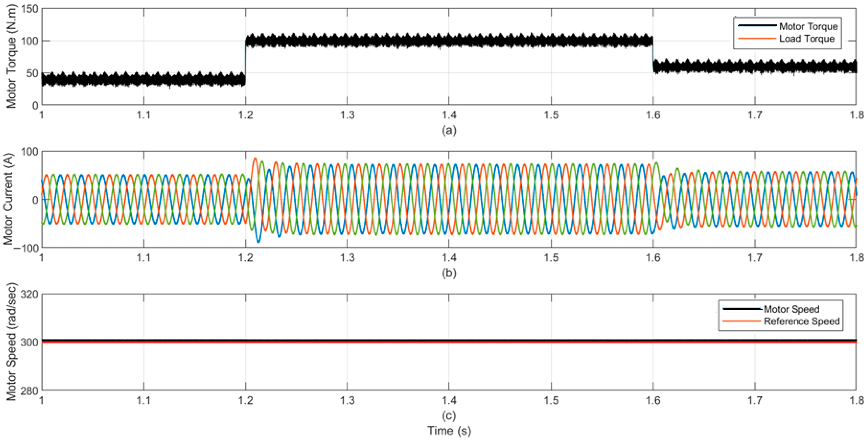 Figure 6, examined the system’s performance during step changes in load torque. At t = 0.5 s, the load torque abruptly increased from 0 N.m to 80 N.m. Then, at t = 1.2 s, it stepped down to 20 N.m. Test 2, detailed in