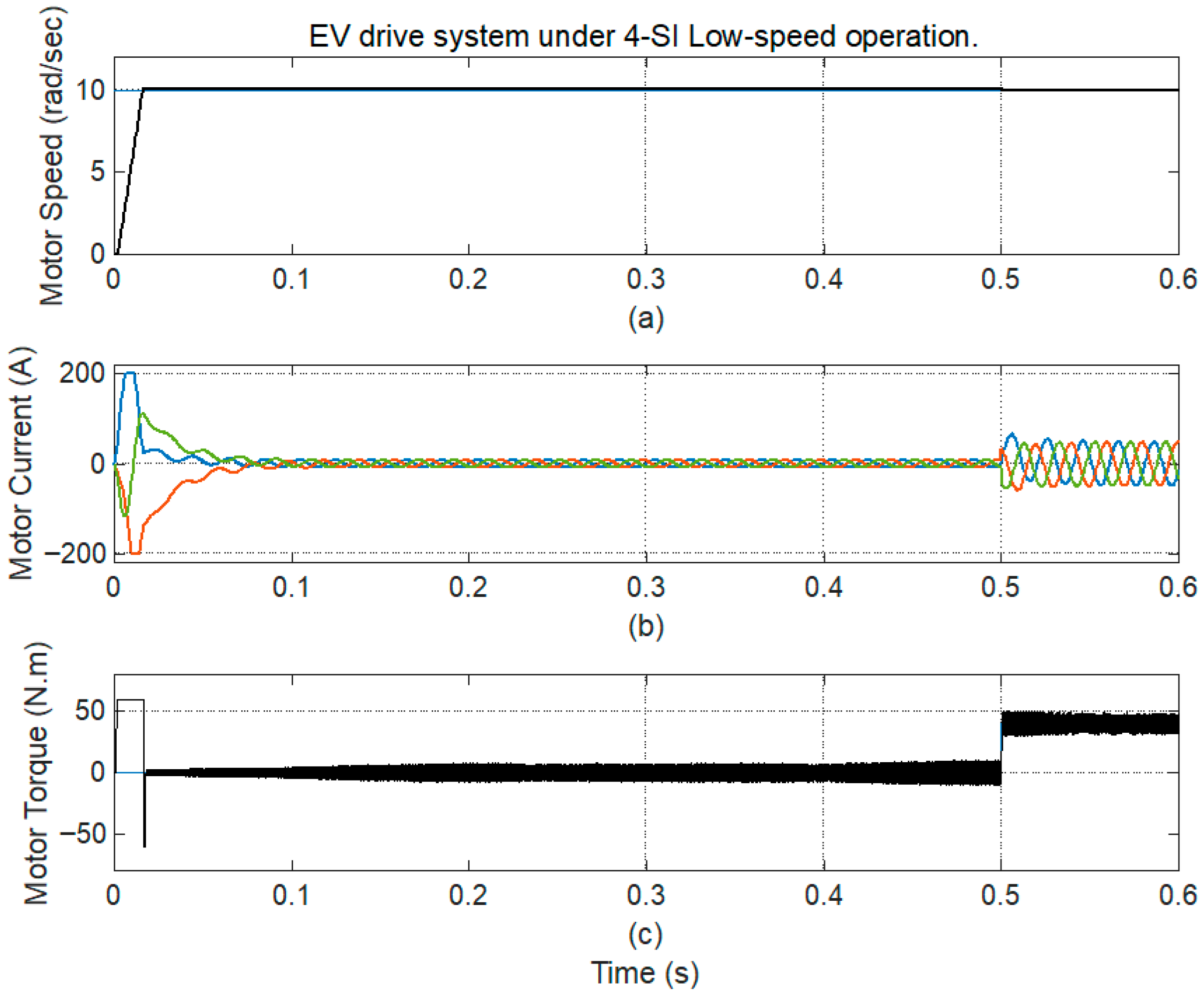 Figure 8 provides a visual representation of the EV induction motor’s response during this critical handover, clearly depicting the moment the control switches from the 6-SI to the 4-SI configuration.
