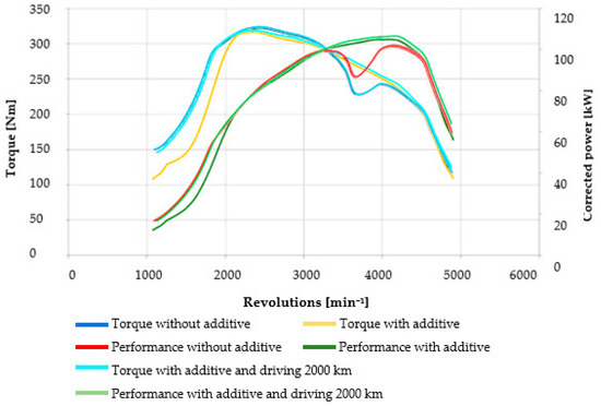 As shown in Figure 2, Figure 3 and Figure 4 and Table 8, improvements were observed in all measured parameters after adding the additive. Regarding performance parameters, an increase was recorded in both engine power and revolutions. The average maximum power value before adding the additive was 103.5 kW, after adding the additive, 104.3 kW, and after adding the additive and driving 2000 km, it was 106.3 kW. The maximum engine speed increased from 4006 min−1 to 4073 min−1. The measured engine power differed slightly from the values stated by the vehicle manufacturer; however, an increase of 0.8 kW was recorded after the additive was added. While this change may fall within the measurement deviation, a further increase of 2.71% in power was observed after driving 2000 km with the additive, which is a measurable improvement within the ±2% accuracy margin of the dynamometer, as specified by the manufacturer.