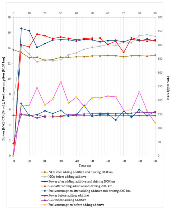 Podskalan (2023) [45] conducted comparable research using the same VIF additive in a Škoda 100. He concluded that NOX emissions were reduced by 11.71%, and fuel consumption decreased by 5.44% after the additive was applied. Similarly,