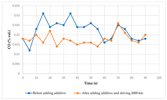 Time course of CO emissions at steady load without additive and after adding additive and driving 2000 km.