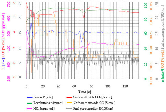 The measurement procedure began with warming up the engine to its operating temperature. Engine performance was first measured through an acceleration test at full throttle without the additive, repeated three times. Subsequently, fuel consumption and engine emissions were measured under a steady load simulated on the chassis dynamometer, also without the additive, and repeated three times. An acceleration test was then conducted under a constant engine load in fourth gear at a speed of 90 km/h for 60 s with a simulated load of F = 600 N. Afterward, the additive was added to the test fuel tank in the prescribed concentration of 700 mL/m3. To ensure that the system was properly flushed with fuel containing the additive, driving was simulated on the chassis dynamometer under a load of 300 N while consuming approximately 2 L of fuel.