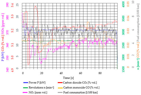Figure 4 presents the CO emission results under the same conditions. In both of these figures, we can observe the improvement of individual parameters, namely the reduction in emissions and fuel consumption after adding the additive. The time-based progression of emissions and fuel consumption without the additive can be seen in Figure 5, while Figure 6 shows the time course following additive application and 2000 km of driving. In these figures, it is possible to see the authentic output of the measuring device when measuring individual emissions and fuel consumption as a function of time and where the improvement of all examined parameters is also visible.
