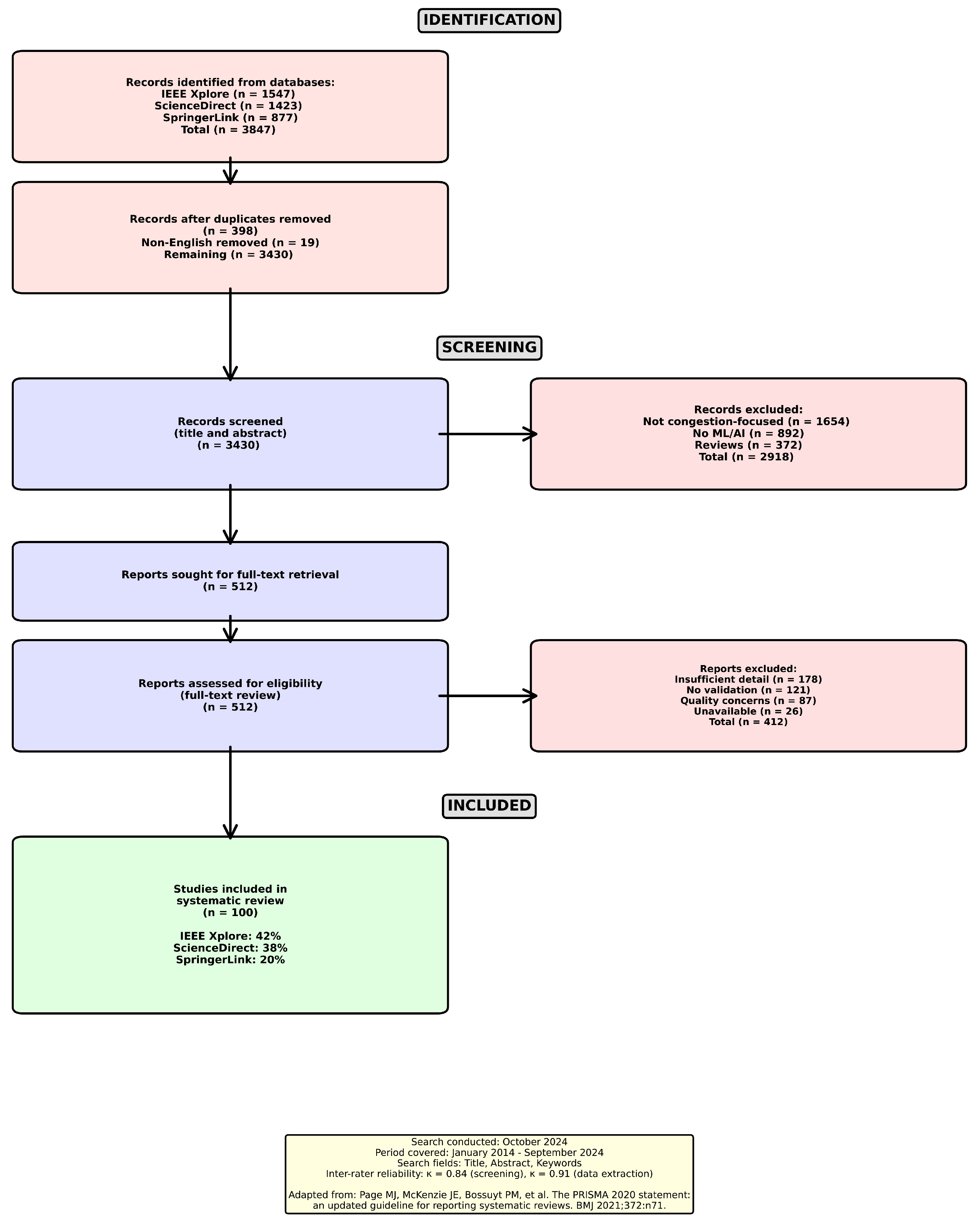 38]. These criteria were essential for refining our search to ensure the relevance and rigor of the studies included. Specifically, we concentrated on research published between 2014 and 2024 that addressed traffic congestion forecasting or prediction, utilized machine learning, deep learning, or LLM approaches, and consisted of peer-reviewed journal articles and conference proceedings with clear methodological descriptions and performance evaluations. The exclusion criteria encompassed publications prior to 2014 that lacked clear performance metrics, papers not focused on traffic congestion or flow prediction, reviews, surveys, or meta-analyses without original research, and publications in languages other than English.