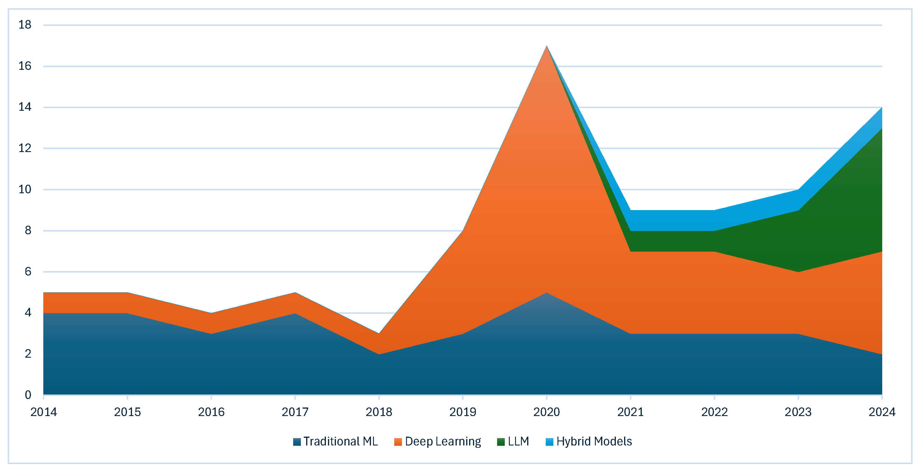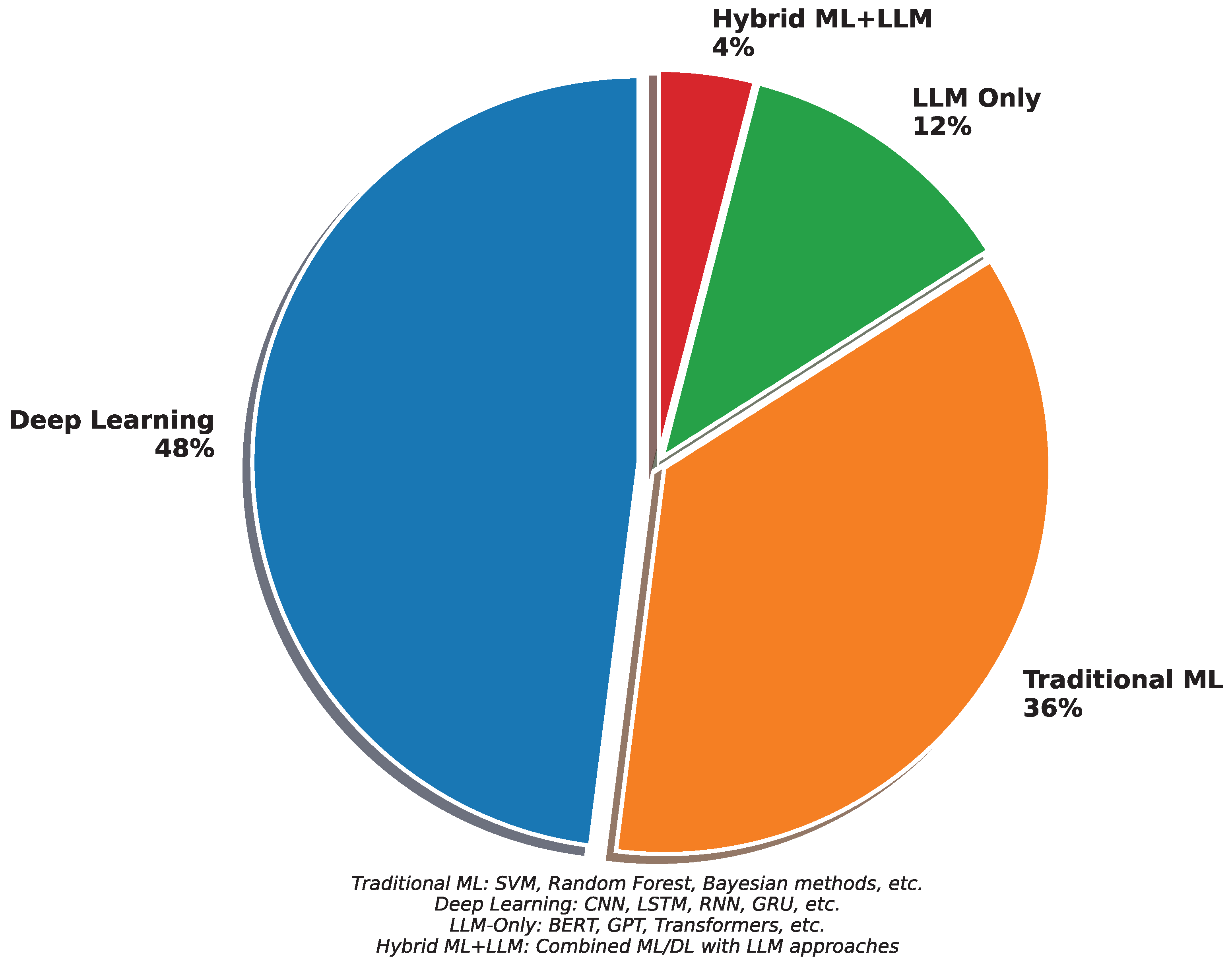 1. Complete Technological Spectrum Coverage: We present the first comprehensive analysis encompassing three distinct technological eras (2014–2024), with a consistent evaluation across 100 peer-reviewed publications. Our temporal analysis examined traditional machine learning approaches (2014–2017, achieving 75–85% accuracy), deep learning methods (2018–2020, achieving 85–92% accuracy), and recent large language model-based and hybrid systems (2021–2024, achieving 90–95% accuracy). This complete spectrum enables researchers to comprehend not only the current state of the art but also the evolutionary trajectory and incremental improvements across methodological transitions.