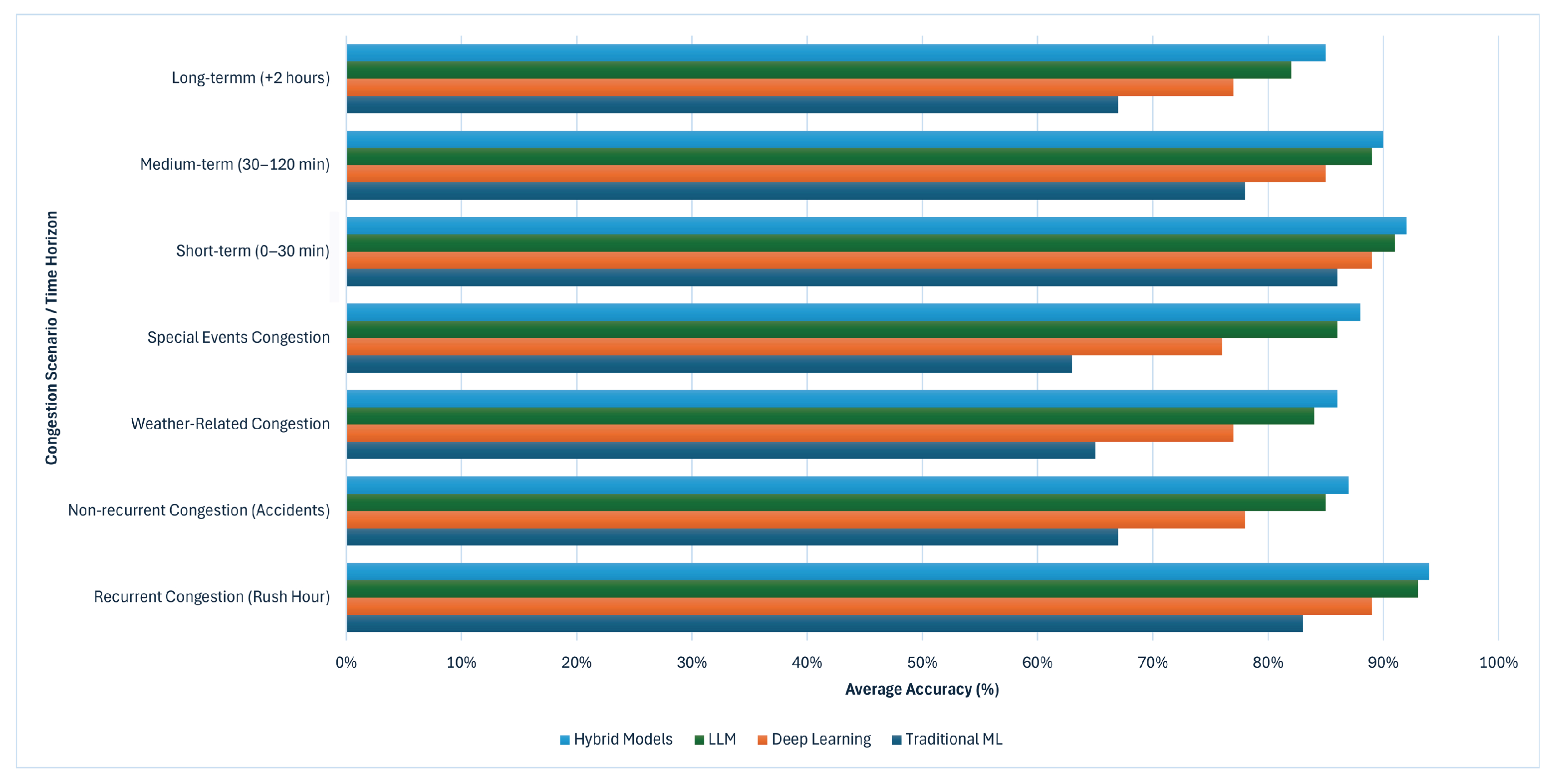 Prediction horizon analysis revealed distinct performance characteristics for each methodology. Short-term predictions (0–30 min) achieved the highest accuracy across all approaches, with deep learning maintaining MAPE values below 8%. Medium-term predictions (30–120 min) showed increasing accuracy divergence, with LLM approaches outperforming traditional methods by 12–18% through superior contextual understanding. Long-term predictions exceeding 2 h remained challenging for all methodologies, though LLMs demonstrated enhanced robustness in scenarios involving scheduled events or predictable traffic pattern disruptions.