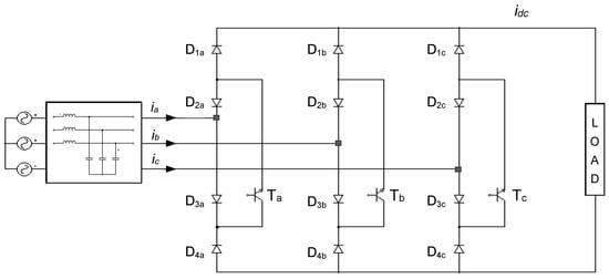 The power circuit of the USMR is composed of three identical branches. Each branch has four power diodes and one power transistor, as illustrated in Figure 1. The power flow is unidirectional, from the AC sources to the load through distinct paths formed by two transistors and four diodes. E.g., the positive AC current ia flows through (D3a, Ta, D1a), while the negative AC current ia flows through (D4a, Ta, D2a). Similarly, the other currents, ib and ic, flow through the corresponding branches. One of the advantages of the ultra-sparse matrix rectifier (USMR) topology lies in its inherent immunity to shoot-through faults, as no short circuits can occur within the same branch. Consequently, there is no requirement for a dead-time (blanking-time) circuit, which is essential in VSI bridge inverters and PWM rectifier configurations addressed in references [19,20,21,22,23,24,25,26,27,28].
