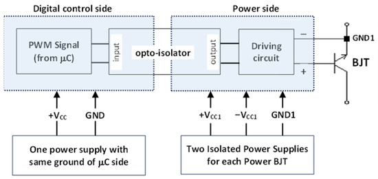 The generated control signals (from microcontroller board or even from logic gates) of power transistors are not connected directly between the base and emitter of the power BJTs. Instead, they are firstly galvanically isolated (using opto-isolators). Galvanic isolation is essential as the emitter terminals do not have the same reference voltage. As indicated in Figure 2, the isolated signals are amplified using a driving circuit incorporated with isolated power supplies, guaranteeing separation of grounds between the low-power side (control side) and the high-power side (base-emitter terminals of the power BJTs).
