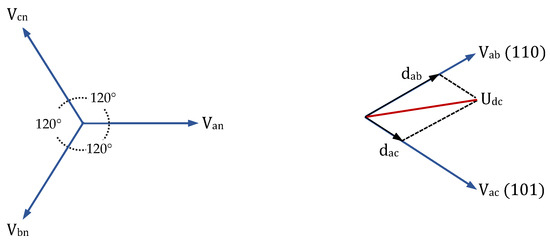 In sector 1, where the angle , the converter switching states (110) and (101) can be applied during the PWM switching. In this case, transistor Ta is considered the pivot switch, which conducts mutually with the other switches Tb and Tc, resulting in instantaneous output voltages of Vab and Vac, respectively.