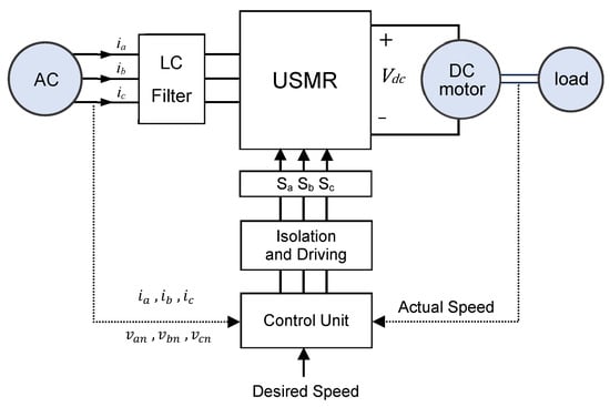 The block diagram of the investigated system is illustrated in Figure 4, where the DC motor is fed from the USMR. The control unit of the USMR-DC motor system is composed of three main parts: