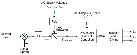 - Outer closed loop speed control loop using a PI controller, where its output represents the peak desired (reference) value of the AC current to be drawn from the AC supply.